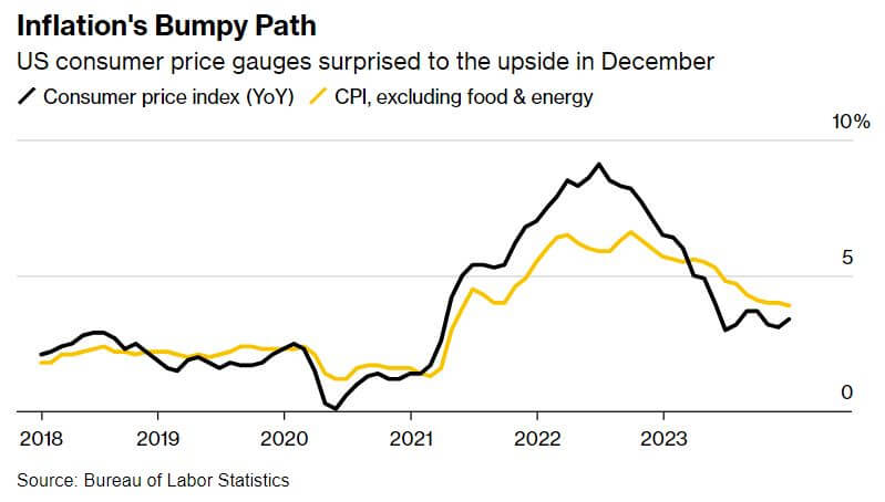 The year concluded with a noteworthy uptick in inflation, according to the latest report from the Labor Department. The Consumer Price Index (CPI) rose by 0.3% in December compared to the previous month and exhibited a 3.4% increase from the corresponding period in the preceding year. This contrasts with the 0.1% monthly gain observed in November, marking an acceleration from the 3.1% annual rise recorded that month. In terms of core prices, which exclude volatile food and energy items, there was a 0.3% increase in December, in line with November but exceeding the Federal Reserve's long-term inflation target of 2%. The year-on-year core prices showed a 3.9% uptick, indicating a modest deceleration from the 4% annual increase observed in November. In December, rising prices were driven by increased expenditures on rent, auto insurance, and dental visits, offset by declines in furniture, toys, and sporting goods. Energy costs rose by 0.4% on a monthly basis, fueled by hikes in gasoline and electricity prices. Federal Reserve officials are unlikely to adjust interest rates during their upcoming meeting. They rely on the personal-consumption-expenditures price index to gauge progress toward their 2% inflation goal. This index, which will be released later this month by the Commerce Department, currently stands just above 2.5%, a positive trend according to New York Fed President John Williams. Thankfully, though CPI surprised to the upside for December, the producer price index (PPI) fell 0.1% for the month. Core PPI rose only 1.8% in annual terms in December, the smallest rise since 2020. The consensus among Fed officials is that the last rate increase occurred in July, reaching a range between 5.25% and 5.5%, a 23-year high. Markets anticipate a potential rate reduction in March, contingent on future inflation readings. The overall decline in inflation since its peak in mid-2022 is attributed to normalized factory production, stabilized supply chains, consumer habit adjustments, and recent moderation in labor markets. However, robust consumer spending and potential price adjustments by businesses could impede the swift progress of disinflation witnessed in recent months.