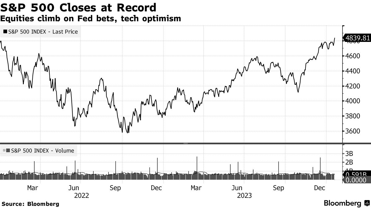Wall Street closed the week on a positive note, reaching all-time highs fueled by speculation that the Federal Reserve will cut rates in the coming year. The S&P 500, led by the technology sector, hit a record high, surpassing 4,800. This surge is driven by optimism about the continued growth of artificial intelligence, with companies like Nvidia and Microsoft leading the way. The positive sentiment is supported by a drop in Treasury volatility, indicating a favorable environment for risk-taking on Wall Street. Additionally, a report highlighting high consumer confidence and lower inflation expectations is seen as "Fed-friendly." The S&P 500 erased losses from earlier in the week, rising by 1%, while the Nasdaq 100, driven by tech stocks, saw a larger increase. Notably, the "Magnificent Seven" cohort, Apple, Amazon, Tesla, Nvidia, Microsoft, Meta, and Alphabet, continues to lead the market. Semiconductor shares also received a boost from a bullish forecast by Taiwan Semiconductor Manufacturing Co. Investors are focusing on growth, technology, and the "AI bubble," with tech-stock funds experiencing significant inflows.