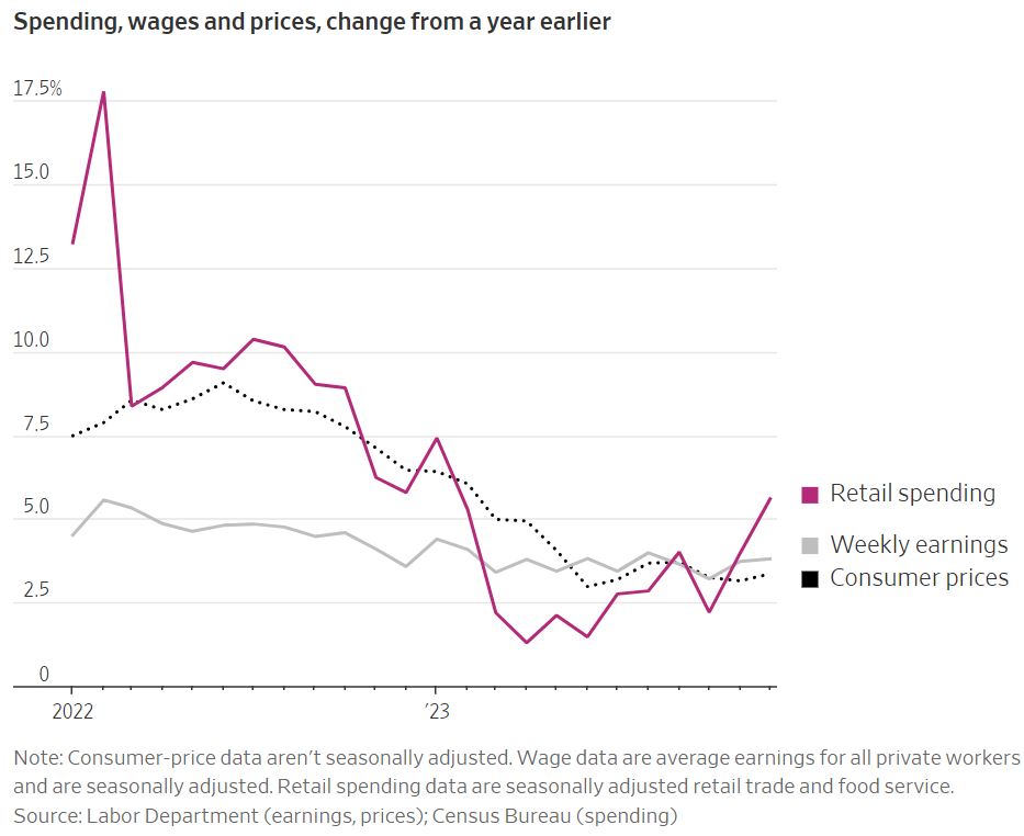 In December, U.S. retail sales exceeded expectations, rising by a seasonally adjusted 0.6% from the previous month, according to data released by the Commerce Department. This increase, following a 0.3% rise in November, suggests a robust finish to the holiday season for retailers. The positive trend was driven by higher spending at stores, auto dealerships, and online platforms. Notably, Americans spent more on vehicles, clothing, department stores, and online purchases. The strong retail performance is attributed to rising wages and moderating inflation, which have bolstered consumers' purchasing power. The 5.6% year-over-year increase in sales also indicates a solid growth trajectory, outpacing the 3.4% rise in the consumer-price index for the year through December. This moderation in spending growth aligns with the broader economic goal of achieving a soft landing, where inflation is controlled without triggering a recession. Consumer spending, a key driver of the U.S. economy, played a significant role in buoying economic growth in 2023. Despite the Federal Reserve's interest rate hikes, consumers continued to spend, particularly on travel and dining. The Fed, anticipating at least three rate cuts in 2024, is closely monitoring inflation and other economic indicators. Online spending reached a record $222.1 billion between November and December, reflecting a 4.9% increase from the previous year. This surge was attributed to discounts and the popularity of "buy now pay later" options. The overall economic growth for 2023 is estimated at 2.6%, defying earlier expectations of a recession. However, forecasts indicate a slowdown to a 1% growth rate in 2024 due to moderating labor market conditions and the impact of higher interest rates. Consumer sentiment in December was positive, fueled by robust hiring, strong wage growth, and optimism about the economic situation.