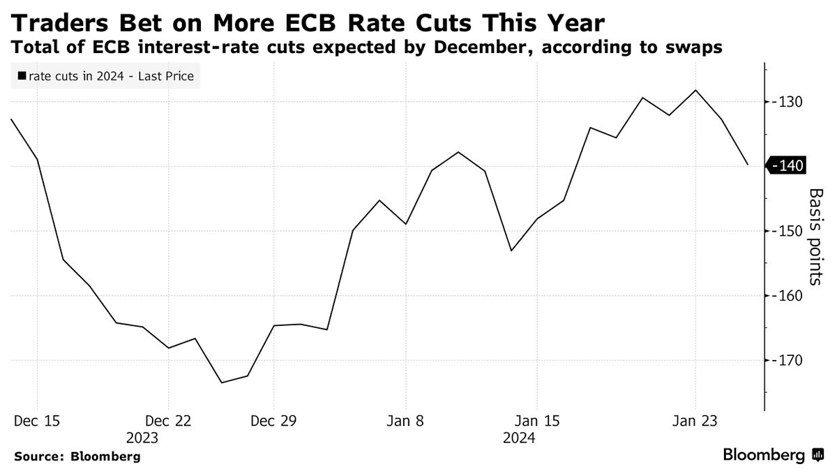 The European Central Bank (ECB) maintained its key interest rate at a record high last week, but ECB President Christine Lagarde left the possibility of rate cuts open, suggesting they might occur as early as spring. Following a series of aggressive interest rate increases, investors are closely monitoring the timing and pace of potential rate cuts, influenced by global central banks signaling a shift towards rate reductions amid easing inflation. Lagarde, in a news conference, acknowledged the market's anticipation of rate cuts in April but stated it was premature to discuss such measures. Lagarde highlighted a slight decline in wage growth in the eurozone, a crucial metric for the ECB's fight against high inflation. While the ECB decided to maintain its deposit rate at 4%, Lagarde's comments led to a rally in European stock markets and a decline in yields on eurozone government debt, suggesting investor expectations of lower borrowing costs. The euro also depreciated against the dollar. Average investor expectations, based on Refinitiv data, indicate an anticipated reduction of around 1.34 percentage points in ECB rates this year, starting possibly in April. The economic backdrop in Europe has been stagnating for over a year, with various challenges impacting the export-focused business model, including slower growth in China, higher energy prices, global trade tensions, and the costly transition to green energy. Lagarde's ECB is cautious about potential risks that may reinforce inflation, such as persistently low unemployment, wage pressures, and supply shocks. The ECB and other central banks are cautious about a premature rate cut, fearing a relapse in inflation, particularly as they approach the challenging task of moving from 3% to 2% inflation.