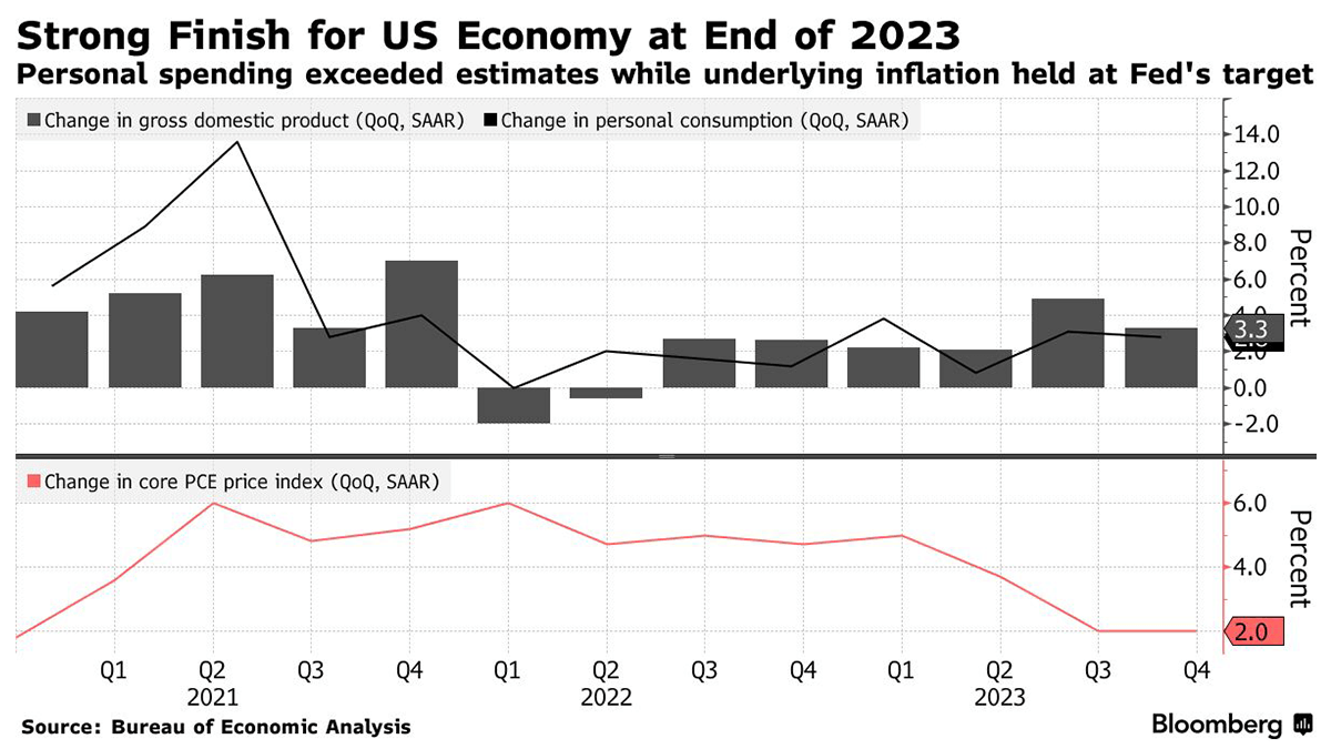 The U.S. economy demonstrated unexpected resilience in 2023, growing at a rate of 3.1% over the year, confounding earlier projections of a looming recession. The Commerce Department last week reported a surprising 3.3% growth in the fourth quarter, though lower than the summer's robust 4.9% pace. The credit for the better-than-expected growth is attributed to consumers who sustained spending on various fronts, including healthcare, dining out, and cars. Meanwhile, the Federal Reserve’s preferred measure of inflation, the personal consumption expenditures (PCE) index, rose 2.6% compared to a year ago in December. The core PCE index, which excludes food and energy costs, rose 2.9% compared to a year ago. The six- month annualized core PCE rate increased by 1.9% over the second half of the year, consistent with the Fed’s 2% inflation target. Economic growth is set to continue in 2024, albeit at a slower pace, supported by an expected Federal Reserve pivot toward interest-rate cuts, moderating inflation, and a strong labor market. Falling mortgage rates are already contributing to increased housing activity, following a challenging year for home sales. However, there are indications that the economy may not sustain such rapid growth. Economists foresee a cooling of consumer outlays, projecting a growth rate of 1% for the current year. Concerns arise from signs such as increasing credit delinquency rates, a decline in the personal saving rate to 4%, and consumers relying on debt to support spending. Despite the overall positive economic outlook, there are signs of a slowing economy, with manufacturing firms reporting a modest drop in production, some large firms announcing layoffs, and certain sectors facing challenges in maintaining pricing power. The prospect of the Federal Reserve lowering interest rates has fueled optimism in the stock market, with expectations that cheaper financing costs could stimulate household spending and business investment.