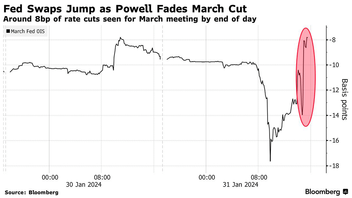 Equity markets finished the week on a positive note as the Nasdaq, S&P 500, and Dow Jones Industrial Average finished the day up 1.74%, 1.07%, and 0.35%, respectively. Big Tech earnings provided a tail wind to equities as META and AMZN rallied while AAPL pulled back. The nonfarm payrolls came in stronger than expected with a gain of 353,000 vs. the expected 185,000, while Average Hourly Earnings year-over-year climbed to 4.5% vs the expected 4.1%. The hot payrolls report drove a surge in Treasury yields on Friday and helped push down rate cut expectations to 115 basis points (bp) from roughly 140 bp on Thursday. Economists have pointed to Fed Chair Powell’s comment that the “Fed doesn’t need to see labor market weakness before cutting” as a sign that the central bank will continue to view disinflation as its primary goal.