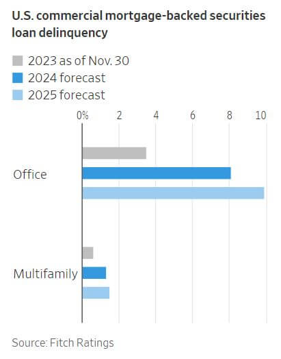 The commercial real estate market is facing a significant challenge with a record amount of loans coming due for refinancing. In 2023, $541 billion in debt backed by various types of commercial properties matured, marking the highest ever for a single year. This trend is expected to continue, with over $2.2 trillion in debt maturing by the end of 2027. While many loans were repaid or extended in 2022 and 2023, the extensions are now expiring, pushing borrowers to confront higher interest rates, vacancies, and weakening cash flows, which are lowering property values. The impact is widespread across various types of commercial properties, with office buildings particularly affected by remote and hybrid work trends, while multifamily and industrial sectors also show signs of weakness. Recent transactions of office buildings at significantly reduced prices compared to pre-pandemic levels signal potential equity losses for owners, with banks already experiencing substantial hits to their loan portfolios as loan defaults rise. Amidst these challenges, the intensifying property crisis in China adds further uncertainty, potentially leading to asset liquidation and further downward pressure on global property values. While concerns about the financial fallout from remote work persist, it's crucial to contextualize these challenges. Despite the severity of the situation, commercial real estate constitutes only a fraction of the overall property market, with offices representing a relatively small portion. Even in the worst-case scenario where all offices lost the entirety of their value in the US, losses from commercial property would only total roughly one-fourth of the broader residential real estate market's downturn experienced during the 2007-2009 financial crisis. Regulatory scrutiny is also increasing, with regulators closely monitoring commercial-property debt exposure, particularly among smaller banks. Measures such as aggressive write-downs and additional reserve requirements aim to mitigate potential losses and ensure financial stability amidst the evolving property landscape. While the impact of commercial real estate challenges is significant, it is unlikely to inflict severe, long-term damage on the financial system.