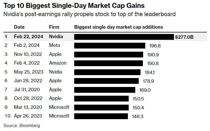 Nvidia, a leading chip company deeply entrenched in the advancement of artificial intelligence (AI), has recently demonstrated remarkable financial performance, showcasing a substantial increase in quarterly sales compared to the previous year. In its latest fiscal quarter, Nvidia's revenue reached $22.1 billion, surpassing analysts' expectations, while net profit soared to $12.29 billion, a significant leap from the previous year's $1.41 billion. The company's optimistic outlook extends into the current quarter, with a sales forecast of approximately $24 billion, further exceeding Wall Street's projections. This stellar financial performance has been accompanied by a surge in Nvidia's stock value, which has more than tripled over the past year, underscoring investors' confidence in the company's growth trajectory. Nvidia's consistent ability to exceed expectations and set ambitious targets has positioned it as a key indicator of the strength of the AI industry. CEO Jensen Huang attributes this success to the increasing demand for computing power fueled by the widespread adoption of AI across various sectors and geographies. He describes AI as reaching a "tipping point," emphasizing the astronomical demand for the technology's underlying computational capabilities. Nvidia's evolution from a gaming-focused chip company to a central player in the AI landscape has been swift and dramatic. Notably, Nvidia's dominance in AI computation is evident, with an estimated market share exceeding 80%. However, Nvidia's growth has not been without challenges. The company has faced constraints due to overwhelming demand for its chips, leading to a prolonged shortage exacerbated by supply chain complexities. Additionally, geopolitical tensions, particularly restrictions on chip sales to China imposed by the Biden administration, have posed further obstacles to Nvidia's expansion efforts. In response to Nvidia's dominance, competitors like Advanced Micro Devices (AMD) are striving to gain market share in the AI computing space. Looking ahead, Nvidia's continued success hinges on its ability to address supply chain constraints, navigate geopolitical challenges, and innovate to maintain its competitive edge in the rapidly evolving AI landscape. Following the release of the earnings data, its shares rallied 16% on Thursday. That equates to a roughly $197 billion gain in market value, the largest single-day increase in a stock’s market value in history. Last week’s rally pushed Nvidia’s market capitalization past $2 trillion.
