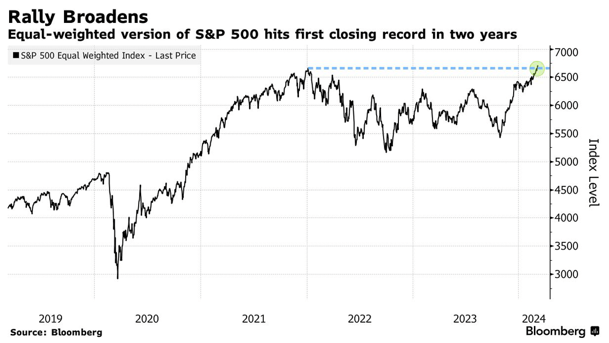 The recent surge in US stocks has prompted concerns reminiscent of past boom-and-bust cycles, raising questions about the potential overheating of the market. Notably, the S&P 500 Index has hit record highs frequently in 2024, with the AI company Nvidia Corp. witnessing a staggering 80% increase in stock value, adding approximately $1 trillion to its market capitalization. Additionally, speculative assets like Bitcoin have experienced significant surges. However, there are indications suggesting that the current strength in the market, driven largely by the economy's resilience and strong corporate earnings, may not necessarily indicate a speculative frenzy. Several of the leading stocks, known as the "Magnificent Seven," have shown signs of faltering, suggesting that investors are not indiscriminately pouring money into the market. Apple, Tesla, and Alphabet have experienced declines, suggesting a shift in investor sentiment. Furthermore, broader market indicators suggest a widening rally beyond just technology stocks. The S&P 500 Equal Weight Index, which treats each constituent equally, has reached a historic high, indicating broad-based market strength. Additionally, data shows an increasing number of S&P 500 stocks reaching all-time highs, though still leaving room for further market participation. The IPO market also presents a contrast to previous bubble periods, with fewer instances of significant first-day price pops for newly listed companies. This suggests a more cautious investor sentiment compared to previous euphoric periods. Valuation metrics, such as price-to-earnings ratios and price-to-sales multiples, indicate that while certain tech stocks remain relatively stretched, they are not at levels seen during past market peaks. Overall, these factors suggest that while concerns about market overheating exist, the current market environment may not necessarily indicate a bubble formation akin to previous cycles.