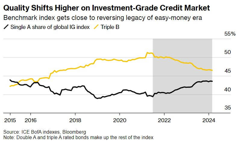The current state of the global high-grade credit market reflects a notable enhancement in quality, reminiscent of the early phases of the era marked by abundant liquidity. Single A bonds are close to becoming the largest part of investment grade indexes for the first time in roughly a decade, while the share made up of the riskiest BBB credits is shrinking. This shift lends credence to assertions that valuations may not be as overstretched as perceived, due to the overall increase in credit quality. Thomas Neuhold of Gutmann Kapitalanlage AG notes that rating agencies are monitoring companies' debt ratios, which exhibit an improving trajectory. This favorable development contributes to the perception of reasonable spreads. The prospect of further rate reductions by central banks bolsters confidence, allowing for a potential tightening of spreads. While the compensation for investing in global investment-grade companies vis-à-vis government bonds has dwindled to a two-year low, the quality of the index has markedly improved. This contrasts sharply with the easy-money era, characterized by a proliferation of debt issuance even by the most vulnerable firms to take advantage of low interest rates. Although remnants of that period persist, recent years have witnessed a recuperation in credit ratings. Data suggests that major rating agencies are on pace to issue more credit upgrades than downgrades among high-grade firms for the fourth consecutive year. Despite lingering uncertainties such as upcoming elections and geopolitical tensions, the prevailing sentiment remains buoyant, supported by expectations of rate cuts and subdued inflation. Market observers anticipate sustained demand for bonds from well-capitalized portfolio managers, a factor likely to exert continued pressure on spreads. While challenges and uncertainties persist, the prevailing demand dynamics are poised to sustain tight valuations in the foreseeable future.