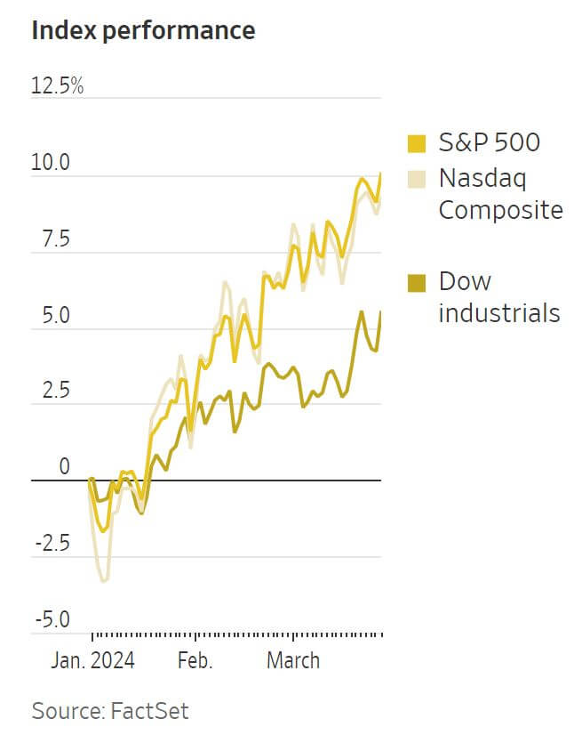 In the early months of 2024, investors witnessed an extraordinary surge in financial markets, surpassing even optimistic expectations. The S&P 500, a bellwether of U.S. equities, surged by an impressive 10% in the first quarter alone, marking its strongest start to a year since 2019. This surge was not confined to equities; cryptocurrencies like bitcoin and traditional safe-haven assets like gold also reached new highs, reflecting a broad-based rally across asset classes. What's particularly noteworthy is the breadth of this rally recently. It wasn't solely driven by a handful of large technology companies, as had been the case in previous years. Instead, nearly all sectors of the S&P 500 experienced gains, demonstrating the resilience and diversity of the market rally. Even small-cap and value stocks outperformed in recent weeks, indicating a broader market participation beyond the tech giants. Contributing to this bullish sentiment were factors such as robust corporate profits, advancements in artificial intelligence, and expectations of monetary policy easing by the Federal Reserve. Investors, buoyed by these factors, continued to pour capital into the markets, undeterred by occasional dips, which were quickly bought up. Despite the optimism, some investors are cautious about the sustainability of such momentum. They wonder whether future returns will be as lucrative, given the substantial gains already realized. Additionally, concerns linger about the valuation of stocks, particularly if corporate profits fail to meet expectations. Analysts anticipate continued earnings growth, but if fundamentals fail to keep pace with market optimism, the momentum could reverse swiftly. Nonetheless, experts remain optimistic about the market's prospects, citing historical trends and the underlying strength of the economy.