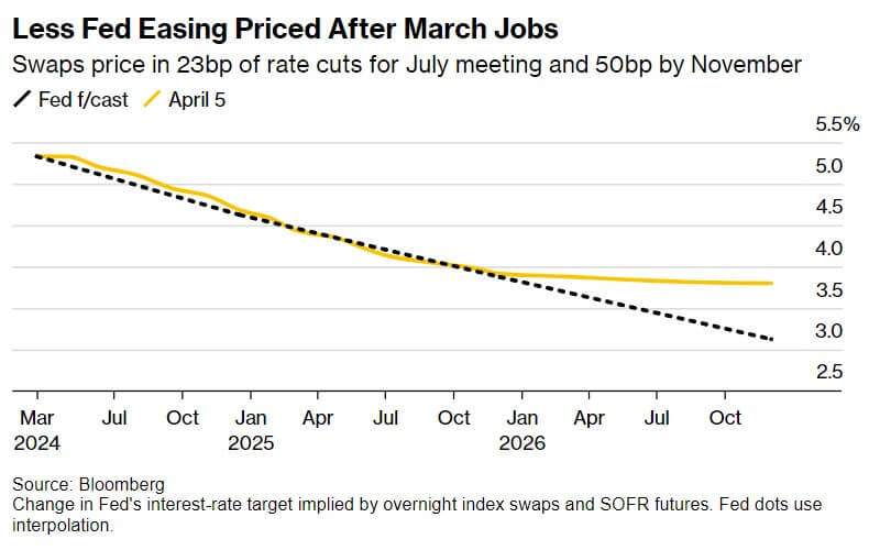 The latest US employment report, released by the Labor Department, indicated robust job growth in March, surpassing economists' expectations. The addition of 303,000 jobs contributed to a decrease in the unemployment rate to 3.8%. However, wage growth has remained modest, with average hourly earnings rising by 0.3% from the previous month and 4.1% from a year earlier, representing the smallest yearly increase since June 2021. The labor force participation rate also ticked up to 62.7%, the first increase since November. Contrary to conventional wisdom, sustained job creation has occurred alongside cooling wage gains and a rising unemployment rate over the past year. This divergence suggests a potential increase in the supply of available workers, possibly influenced by factors such as immigration. Despite a high number of job openings, the rate of job quits has returned to pre-pandemic levels, indicating a moderation in labor market competitiveness among businesses. Moreover, employment growth has been concentrated in "high-touch" sectors such as private education, healthcare, leisure, and hospitality, which require in-person interactions. While employment in these sectors initially declined during the pandemic, recent growth suggests a potential recovery, particularly in healthcare due to the aging population's increasing needs. Nonetheless, investors remain cautious, particularly regarding the potential impact on Federal Reserve interest-rate policy. A strong labor market could heighten concerns about inflation, as increased consumer spending power may fuel price pressures. Additionally, a robust job market provides the Fed with greater flexibility in delaying interest-rate cuts. Following the release of the jobs data, Treasuries sold off across the yield curve, but the relatively modest wage gains limited the increase in yields. Swaps contracts indicate that traders now only put a 52% chance of a rate cut from the Fed in June, but a near 100% chance of a cut in July. The monthly survey by BMO Capital Markets showed that 57% of investors would buy bonds if yields rose following the jobs report, indicating that the current level of yields is considered attractive by some despite a possible delay in the Fed cutting rates.