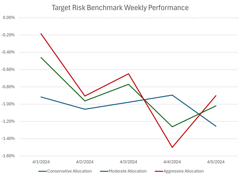 A volatile week for markets resulted in divergent results for investors with balanced portfolios with differing risk tolerances. The aggressive risk benchmark below has a roughly 90% allocation to the Russell 3000 and MSCI All Country World Index Ex USA, with limited exposure to the US Aggregate Bond Index. The moderate risk benchmark is made up of a roughly 60/40 global stock and bond split of the same indices, while the conservative risk benchmark has a roughly 90% allocation to the US Aggregate Bond Index and a small exposure to global equity benchmarks. All three risk tolerances fell for the week as geopolitical tensions in the Middle East continued to drive up oil prices. Those concerns dragged down the prices of both stocks and bonds. However, on Friday the strong US jobs report showcased continued momentum in the US economic trajectory. That resulted in a rally in equity prices, but a selloff in bonds as the prospect of interest rate cuts was pushed back further into the year. Notably, international equities had a smaller loss for the week, even after the strong rally in the Russell 3000 on Friday. This resulted in both the aggressive and moderate risk tolerances trimming weekly losses to end the week, while the conservative allocation lost more ground. The aggressive allocation limited its loss for the week to -0.9%, while the moderate allocation lost -1.02% and the conservative allocation gave up -1.25%.