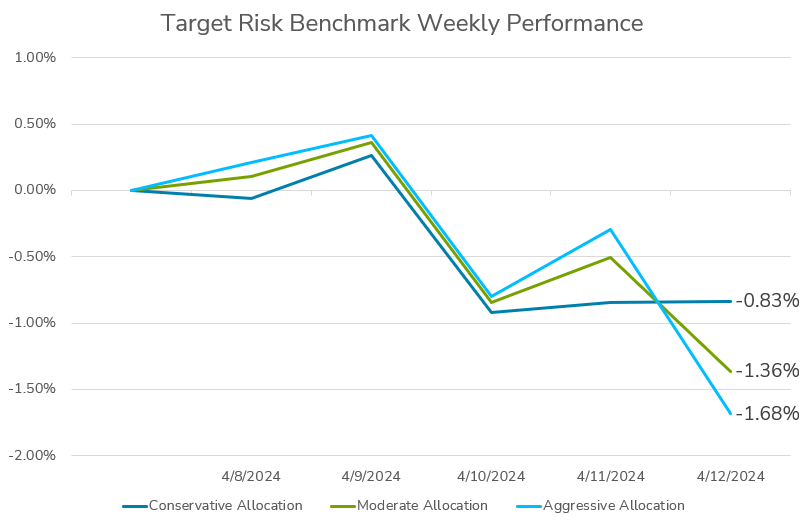 Last week proved to be another difficult week for investors with balanced portfolios. The aggressive risk benchmark below has a roughly 90% allocation to the Russell 3000 and MSCI All Country World Index Ex USA, with limited exposure to the US Aggregate Bond Index. Meanwhile, the moderate risk benchmark is a 60/40 split of global equities and bonds, while the conservative risk benchmark has a roughly 90% allocation to US bonds. All three risk tolerances experienced small gains to start the week as investors awaited the release of the March Consumer Price Index data on Wednesday. When inflation came in hotter than expected for a third consecutive month, stocks and bonds sold off in tandem, resulting in comparable losses across the three risk benchmarks. Equities recovered somewhat on Thursday, with the aggressive and moderate risk benchmarks benefiting most. However, geopolitical tensions came to the fore on Friday, with fear of an imminent direct attack on Israel from Iran weighing heavily on risk appetite. The flight to safety saw strong demand for haven assets such as bonds, pushing the yield on the US 10 Year Treasury note back below 4.5%, while stocks sold off again. The conservative risk benchmark benefitted from this dynamic, limiting its weekly losses to -0.83%. The larger equity allocation in the moderate and aggressive risk tolerances benchmarks resulted in their losses increasing for the week to -1.36% and -1.68%, respectively.