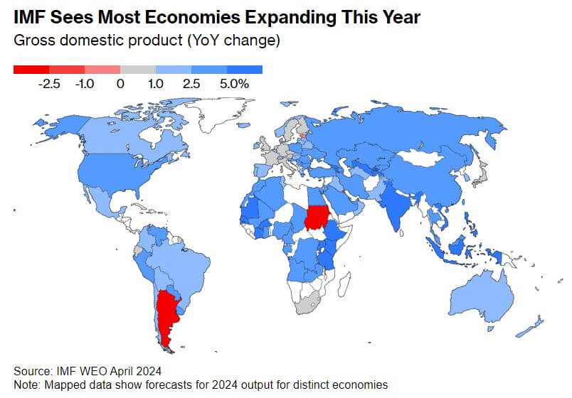 The International Monetary Fund (IMF) has revised its global economic growth forecast slightly upward, now expecting a 3.2% expansion in 2024, citing strength in the US and select emerging markets. However, the outlook remains cautious due to persistent inflation and geopolitical risks. While the IMF's projection aligns closely with Bloomberg Economics' estimate, it warns of challenges such as high borrowing costs and the withdrawal of fiscal support, which are dampening short-term growth. Moreover, long-term prospects are subdued due to low productivity and global trade tensions. While the world economy has avoided the worst stagflation outcomes post-pandemic, its potential for growth in the coming years is hindered. The IMF also issued a warning about financial stability risks, particularly regarding a potential resurgence of consumer-price growth. Tobias Adrian, responsible for capital markets at the IMF, highlighted the threat posed by high inflation and investors' expectations of monetary policy easing. Furthermore, the IMF expressed concern about the under-performance of low-income countries, attributing it to factors such as the stronger US dollar and elevated food, fuel, and fertilizer costs. IMF Chief Economist Pierre-Olivier Gourinchas noted that while the US economy has rebounded strongly, many low-income developing countries still struggle with pandemic-related challenges. Geopolitical risks, especially conflicts in Ukraine and the Middle East, pose additional threats to global economic stability. Regarding specific economies, the IMF adjusted its growth forecasts, with the US seeing an upward revision but the Euro area facing downward pressure due to tighter monetary policy and increased energy costs. China's growth outlook remained steady, with concerns about its real estate sector and export practices. The IMF also highlighted fiscal policy concerns in the US, stating that while the nation's economic performance is impressive, its budget policy poses risks to long-term fiscal sustainability and global financial stability.