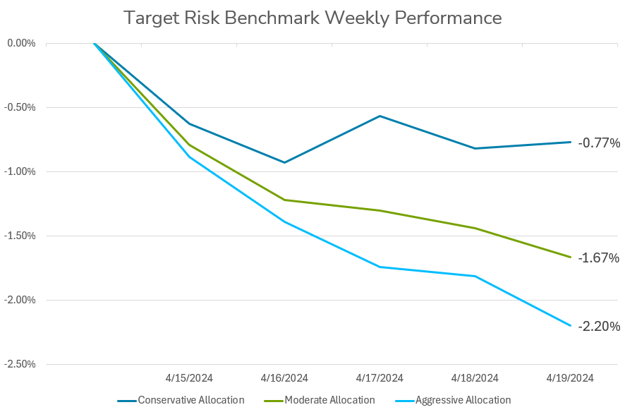 Investors in balanced multi-asset portfolios experienced a second consecutive week of losses driven by declines in both stocks and bonds, as shown by the target risk benchmarks below. The aggressive risk benchmark has a roughly 90% allocation to the Russell 3000 and MSCI All Country World Index Ex USA, with limited exposure to the US Aggregate Bond Index. Meanwhile, the moderate risk benchmark is a 60/40 split of global equities and bonds, while the conservative risk benchmark has a roughly 90% allocation to US bonds. Geopolitical concerns regarding the conflict between Israel and Iran weighed on risk assets to start the week. Then in the middle of the week several US Federal Reserve officials made hawkish comments regarding the path of interest rates, indicating that the Fed may not be able to lower interest rates in an environment of continued above-target inflation coupled with ongoing momentum in the economy. This sent the yield on the US 10 Year Treasury note well above 4.5%, though it retraced slightly to end the week at 4.62%. Equities came under pressure as well, as several of the large technology companies sold off as quarterly earnings announcements come into focus. Nvidia Corp and Super Micro Computer Inc. both sold off substantially on Friday as chipmakers reported weaker demand than expected. Netflix Inc also tumbled to end the week due to a weak forecast for revenue growth moving forward. The conservative risk benchmark recovered its earlier fall slightly to end the week down -0.77%, while the moderate and aggressive risk benchmarks continued to drop throughout the week, ending with losses of -1.67% and -2.2% respectively.