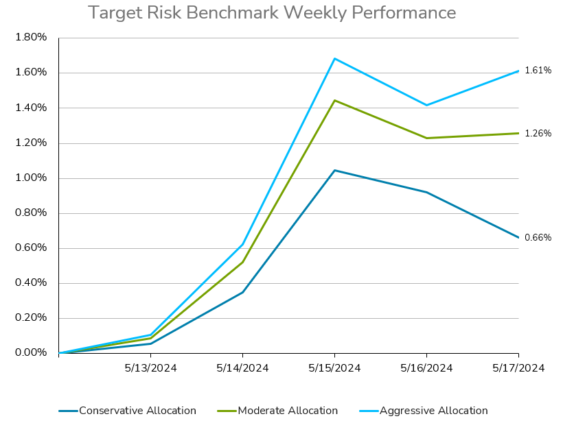 Investors in multi-asset balanced portfolios enjoyed another week of substantial gains, as shown by the performance of the risk tolerance benchmarks. The aggressive risk benchmark has a roughly 90% allocation to the Russell 3000 and MSCI All Country World Index Ex USA, with limited exposure to the US Aggregate Bond Index. The moderate risk benchmark is a 60/40 split of global equities and bonds, while the conservative risk benchmark has a roughly 90% allocation to US bonds. Stocks continued their upward trajectory for a fourth consecutive week, with the Dow Jones Industrial Average surpassing the 40,000 mark for the first time. This bullish trend was driven by favorable inflation reports that bolstered hopes for Federal Reserve rate cuts, along with strong corporate earnings. The S&P 500 experienced its longest weekly winning streak since February, despite some cooling in momentum over the past two days. All risk tolerances benefited from the relatively benign inflation report on Wednesday, which boosted both stocks and bonds. However, towards the end of the week, Treasury yields increased, signaling cautious optimism about the strength of the economy. That resulted in the conservative risk tolerance benchmark giving up some of its gain for the week, finishing up 0.66%. In contrast, the moderate and aggressive risk tolerance benchmarks rebounded on Friday, finishing with gains of 1.26% and 1.61% for the week, respectively.