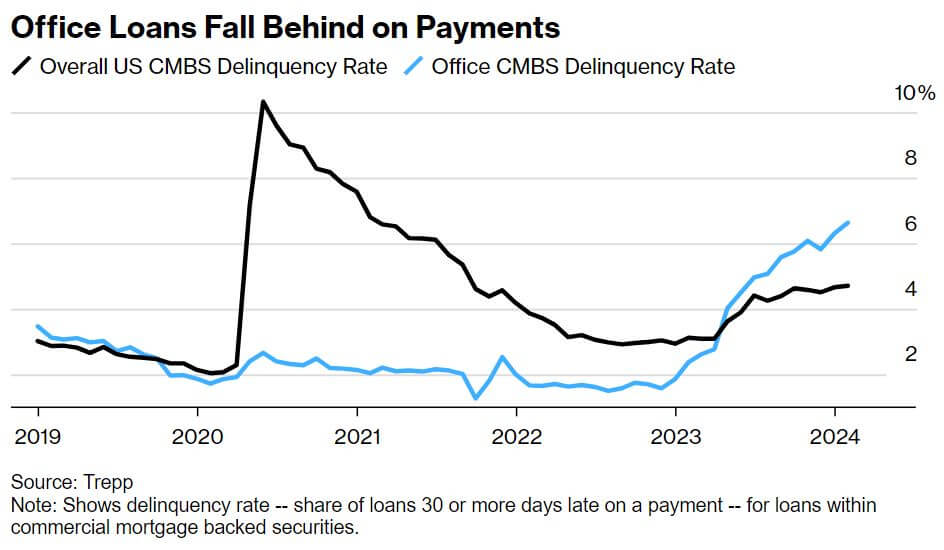 For the first time since the financial crisis, AAA-rated commercial mortgage-backed securities (CMBS) are experiencing significant losses. This is highlighted by the recent performance of a $308 million note secured by a mortgage on the 1740 Broadway building in Manhattan. Investors received back less than 75% of their initial investment, marking a historic post-crisis loss for top-rated bonds, as reported by Barclays Plc. Lower-tier creditors faced total losses. This event underscores the severe distress in segments of the US commercial real estate market, particularly older office buildings with a single anchor tenant, such as 1740 Broadway. Analysts predict more losses as additional loans are sold at significant discounts. With $700 billion in non-agency CMBS and $3 trillion in commercial mortgages on bank balance sheets, even minor increases in losses could impact the financial system long-term, though a repeat of the 2008 financial crisis is not expected. The delinquency rate for office loans in CMBS reached 6.4% in April, the highest since 2018, while 31% of all office loans in CMBS were distressed as of March, up from 16% the previous year, according to KBRA Analytics. Cities like Chicago and Denver are particularly affected, with delinquency rates of 75% and 65%, respectively. Factors contributing to these losses include rising interest rates and decreasing cash flow, resulting in significant equity losses and impaired secured debt investments, according to Harold Bordwin of Keen-Summit Capital Partners. Industry experts warn that similar losses may affect other AAA-rated CMBS tied to malls and office spaces. The ongoing challenges in the commercial real estate market are expected to extend, affecting numerous office deals and revealing hidden risks in the market.