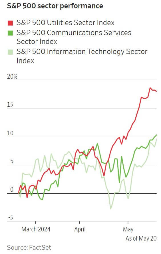 Utilities have emerged as a surprising leader in the stock market this spring, outperforming even in a year filled with unexpected developments on Wall Street. This rise is partly a recovery from a difficult 2023 and partly due to increased confidence that the U.S. economy can withstand higher interest rates and capitalize on the artificial intelligence (AI) boom. Recent economic data shows job growth slowing and inflation easing without a significant economic downturn, which would potentially pave the way to interest rate cuts and lower bond yields. This stability has shifted investor focus to power companies, which are expected to supply energy to the growing number of data centers driven by AI advancements. Over the past three months, the S&P 500 utility sector has surged 18%, surpassing the 11% gain of the information-technology sector. Notably, Texas-based Vistra has seen a 145% increase in its stock price this year, outshining even Nvidia's well-publicized 93% rise. While utility stocks are not anticipated to reach the high price/earnings multiples of tech giants, there is a strong belief that the sector will benefit from the expected surge in U.S. electricity demand driven by AI-related data centers. Citi analysts project that data centers could account for 10.9% of U.S. electricity demand by 2030, up from the current 4.5%. The rise in utility stocks marks a significant shift from the previous year when the Federal Reserve's interest rate hikes made higher yielding bonds more attractive, drawing investors away from utilities. Despite continuing low returns on utility dividends compared to government debt, projections of increasing electricity demand have drawn investors back to the sector. This shift has turned traditionally defensive utility stocks into a surprising growth bet. The rally started with independent power producers and has spread to regulated utilities. However, analysts caution that companies with less exposure to data centers or those manufacturing grid equipment might not perform as well. There is also concern that if the U.S. economy slows or AI enthusiasm wanes, utilities might face challenges before they can capitalize on the anticipated growth. If power demand growth falls short, consumers could face higher costs, and regulators might limit utility returns, affecting the sector's investment appeal. Overall, while utilities present a promising growth opportunity linked to the AI-driven increase in electricity demand, potential regulatory and economic risks remain significant considerations for investors.
