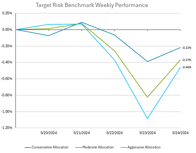 Investors in balanced multi-asset portfolios experienced mild losses last week after several strong weeks across all asset classes. The aggressive risk benchmark below has a roughly 90% allocation to global equities, with a small allocation bonds. The moderate risk benchmark is a 60/40 split of global equities and bonds, while the conservative risk benchmark has a roughly 90% allocation to US bonds. Recent data indicating that American consumers have tempered their inflation expectations has positively impacted stock markets, fostering optimism about potential Federal Reserve rate cuts within the year. The University of Michigan reported that consumers now anticipate a 3.3% annual inflation rate over the next year, down from the previous 3.5% projection. This revision has lessened pessimism about inflation and suggested that consumer spending might slow, thereby reducing inflationary pressures from demand. Consumer sentiment in May reflected growing concerns about the labor market and the likelihood of prolonged high interest rates. This sentiment could potentially lead to reduced consumer spending in the coming months. Market analysts emphasized the ongoing anxiety surrounding Fed policies. Despite this, corporate earnings have remained resilient. While US stocks as represented by the Russell 3000 Index recovered Friday to limit losses for the week to -0.16%, international equities, represented by the MSCI ACWI ex USA Index, ended down -1.02% for the week. The Bloomberg US Aggregate Bond Index had a loss for the week of -0.2%.