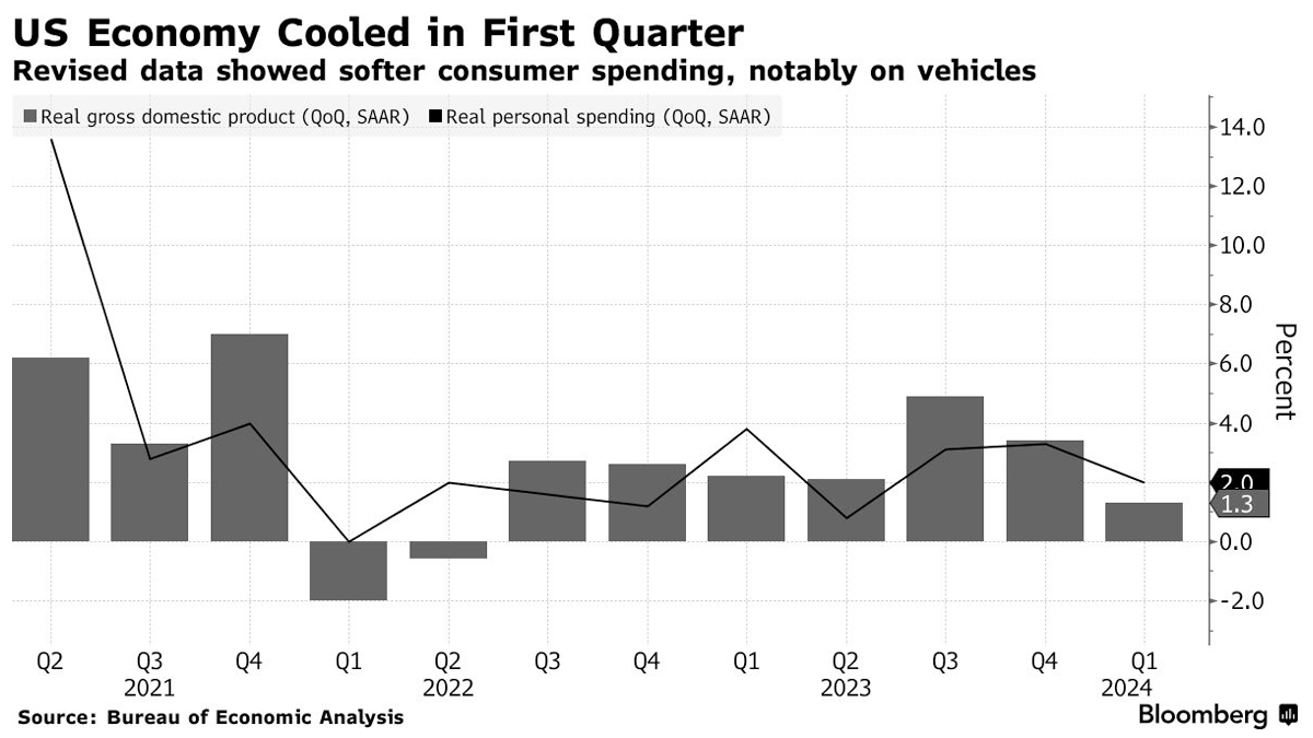 In the first quarter of 2024, the U.S. economy expanded at a revised annualized rate of 1.3%, down from an initial estimate of 1.6%, according to the Bureau of Economic Analysis in a separate report. This slowdown is primarily due to weaker consumer spending, especially on goods such as automobiles, reflecting high interest rates, reduced pandemic-era savings, and slower income growth. Personal spending, a crucial driver of economic growth, increased by 2.0%, lower than the previously reported 2.5%. Despite the reduced consumer spending, other economic indicators provided mixed signals. Federal government spending decelerated, and net exports detracted from growth for the first time in two years. Conversely, business and residential investments showed stronger-than-expected growth, with nonresidential investment rising by 3.3% and residential investment surging by 15.4%. A critical measure of domestic demand, final sales to private domestic purchasers, increased by 2.8%, down from an initial estimate of 3.1%. This metric's resilience suggests underlying demand remains robust, even as the headline GDP figures indicate a mild slowdown. Additionally, the BEA's report on gross domestic income (GDI), which complements GDP by measuring income generated and costs incurred in production, indicated a 1.5% increase in the first quarter. Corporate profits, however, showed a decline, with pre-tax profits falling by 0.6% and after-tax profit margins remaining stable at 15.2%. Economists, including Nationwide Financial Markets Economist Oren Klachkin, anticipate continued GDP growth throughout 2024, albeit at a moderated pace. Klachkin noted that while there are cautionary signs in the economic outlook, they do not warrant significant pessimism.