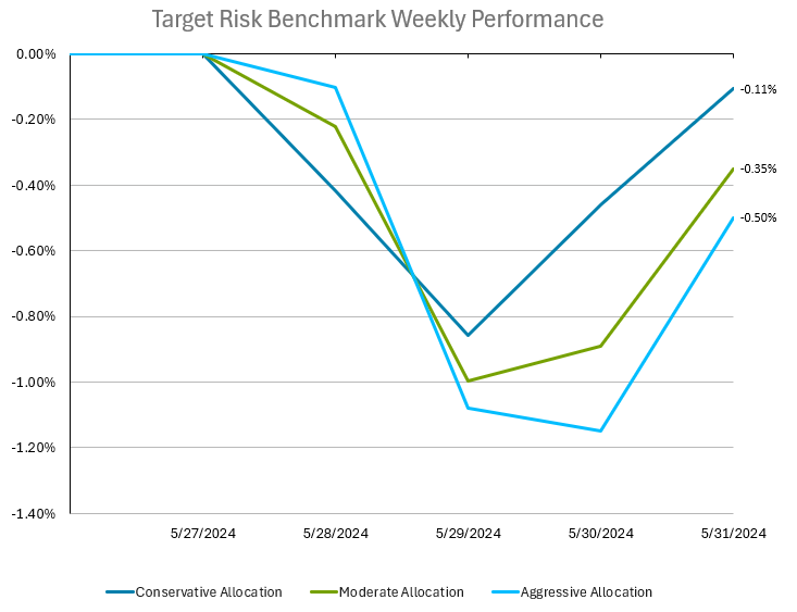 Investors in balanced multi-asset portfolios had losses for the second week in a row, though a rally to end the week on Friday reduced those declines by a significant amount. The aggressive risk benchmark below has a roughly 90% allocation to global equities, with a small allocation to bonds. Meanwhile, the moderate risk benchmark is a 60/40 split of global equities and bonds, while the conservative risk benchmark has a roughly 90% allocation to US bonds. The first two trading days of the week saw significant declines in the Bloomberg US Aggregate Bond Index. Those losses were compounded by declines in both US and international stocks on Wednesday. The stock market experienced a downturn due to a sell-off in major technology companies, including Nvidia and Microsoft, ending a five-week winning streak. Disappointing quarterly earnings results from companies like Dell and Salesforce contributed to the decline. Bank of America strategists warned that investors heavily reliant on tech stocks might face challenges as other sectors gain traction. Value stocks could outperform growth stocks, potentially causing pain for those concentrated in tech. The top six stocks now make up a larger share of the S&P 500 than ever before. However, macroeconomic data came in soft on Thursday and Friday, suggesting a potential easing in inflation, which led both stocks and bonds to recover much of their losses from earlier in the week. The conservative risk tolerance benchmark ended the week with a small loss of -0.11%, while the moderate and aggressive allocations ended with larger losses of -0.35% and -0.5%, respectively.