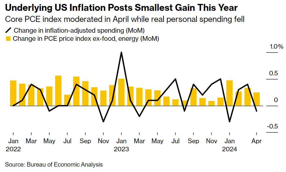 In April, the Federal Reserve's preferred measure of underlying U.S. inflation, the core personal consumption expenditures (PCE) price index, increased by just 0.2% from the previous month, marking the smallest monthly advance this year according to data from the Bureau of Economic Analysis (BEA). This measure, which excludes volatile food and energy prices, indicates a potential easing of inflationary pressures, providing some reassurance to Fed officials regarding the inflation trajectory after a period of disrupted progress in the first quarter. Concurrently consumer spending saw an unexpected decline of 0.1%, influenced by reduced spending on goods and a softer increase in services spending. Despite healthy demand for workers, wage growth has decelerated, with overall incomes rising by 0.3% and wages and salaries advancing by 0.2%, the smallest increase in five months. The decline in spending, combined with moderated wage growth, suggests a cooling in household demand despite steady job and income growth. The modest rise in services outlays of 0.1% was the smallest since August, with a 0.4% decrease in goods spending, primarily due to lower expenditures on gasoline and vehicles. Although healthcare spending supported services outlays, other areas like dining out, recreation, and transportation experienced declines. Financial markets responded to this data with lower Treasury yields, a rise in S&P 500 index futures, and a decline in the dollar index. Traders in swaps markets continue to anticipate at least one interest rate cut by the Fed this year, reflecting expectations of a more accommodative monetary policy in light of the recent data.
