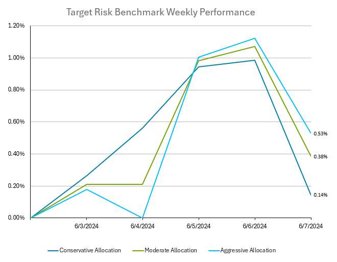 Investors in balanced multi-asset portfolios experienced dramatic reversals last week, with macroeconomic data driving shifts in risk sentiment. The aggressive risk benchmark below has a roughly 90% allocation to global equities, with a small allocation to bonds. Meanwhile, the moderate risk benchmark is a 60/40 split of global equities and bonds, while the conservative risk benchmark has a roughly 90% allocation to US bonds. US mega cap technology stocks led the charge higher for US equities in the middle of the week. Bond yields dropped in the middle of the week as some US macro data came out softer than expected. International stocks also reacted positively when the European Central Bank delivered a rate cut as widely expected. This led to healthy gains in the target risk benchmarks across all risk tolerances and asset classes through Thursday. However, the jobs report on Friday came in hotter than expected, causing bond yields to jump sharply higher, reversing the decline in yields from earlier in the week. Short-term fixed income instruments saw a particularly large rise in yields. This led to a large loss on Friday in the conservative target risk benchmark relative to the more aggressive target risk benchmarks. The aggressive target risk benchmark held onto more of its gain from earlier in the week, finishing with a return of 0.53%. The moderate target risk benchmark ended the week with a gain of 0.38%, while the return in the conservative target risk benchmark was a muted 0.14%.