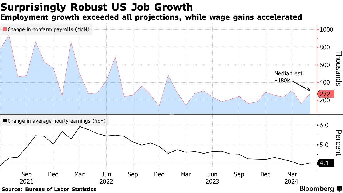 The U.S. labor market displayed unexpected strength in May, with nonfarm payrolls rising by 272,000, surpassing economists' predictions of 190,000. This notable increase, accompanied by a 4.1% year-over-year rise in average hourly earnings, overshadowed the slight uptick in the unemployment rate, which climbed to 4% from April's 3.9%, marking its highest point in over two years. The labor market's resilience contrasts with recent economic data suggesting a cooling trend, including weaker-than-expected figures for retail sales, consumer spending, construction, and industrial production. Additionally, there has been a modest rise in unemployment claims and a faster-than-anticipated decline in job openings, indicating an easing demand for labor. Despite these signs of a slowing economy, the labor market's unexpected vigor in May complicates the narrative of a steadily cooling economic landscape. This shift in sentiment could be seen in the market’s reaction, with bond yields rising and interest-rate futures indicating a greater probability of the Federal Reserve maintaining current rates past September. Fed officials, as reflected in the minutes from their April 30-May 1 meeting, have emphasized the need to keep rates steady for longer to ensure inflation continues its downward trajectory. With the Fed's next meeting approaching, it is widely expected that rates will remain unchanged, as officials reassess their projections and strategies to sustain economic stability and control inflation.
