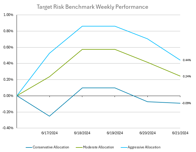 Positive equity returns, primarily in the U.S., helped aggressive and moderate multi-asset class balanced portfolios outperform this past week, as shown by the target risk benchmarks below. The aggressive risk benchmark below has a roughly 90% allocation to global equities, with a small allocation to bonds. Meanwhile, the moderate risk benchmark is a 60/40 split of global equities and bonds, while the conservative risk benchmark has a roughly 90% allocation to US bonds. US bonds were marginally down last week, as slowing retail sales and housing activity were offset by strong business sentiment and industrial production. The Bloomberg US Aggregate Bond Index returned -0.16% for the week, and the yield on the US 10 Year Treasury Note was slightly higher, ending the week at 4.26%. US equities started the week on a strong note, fueled by optimism over artificial intelligence spending, but then faded through the end of the week as an estimated $5.5 trillion in equity options expired on Friday, leaving stock traders more cautious. The Russell 3000 Index rose 0.66% for the week. International markets continue to lag the U.S. due to continued strengthening in the U.S. dollar as well as the fallout from the prior week’s elections, particularly in France where borrowing costs have risen following the strong electoral gains made by populist parties. The MSCI ACWI ex UMA IMI Index rose 0.30% for the week, underperforming the U.S. market. The flat interest rate movement and underperformance of corporate credit contributed to a moderate down week for the gained 0.24% for the week, while the aggressive target risk benchmark rose 0.44%, both helped by the greater weight in equities.