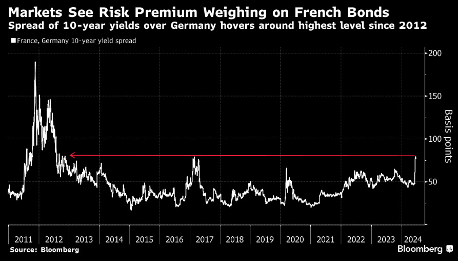 Investors are expected to impose higher interest rates on French government borrowing, which could have long-term consequences for France’s economy. Even if Le Pen's National Rally does not secure a majority in next month’s snap elections for the National Assembly, the market will likely continue demanding higher yields for French debt due to political uncertainty. This situation is expected to persist until the 2027 presidential election. This month, the yield on French 10-year bonds has risen by over 30 basis points, reaching levels last seen during the euro-area debt crisis. Bond investors hold concerns over Le Pen’s proposed budget measures and potential strains on France’s relations with the EU, which could challenge the euro-area's stability. Even if Macron’s party secures a parliamentary majority, a strong far-right presence could still obstruct legislative processes and hinder reforms, maintaining the risk premium on French bonds.