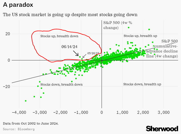 The US stock market has experienced a unique situation where the overall market is rising despite a significant number of individual stocks declining. Notably, there has been a stark divergence between the performance of market-cap weighted and equal-weighted versions of the S&P 500. Over the past month, the S&P 500 rose 2.4% while the cumulative advance-decline (A/D) line (the running total of the number of stocks rising versus falling each day) fell by over 1000, a rare occurrence based on data since 2002. Historical data offers little guidance on navigating such a market scenario.