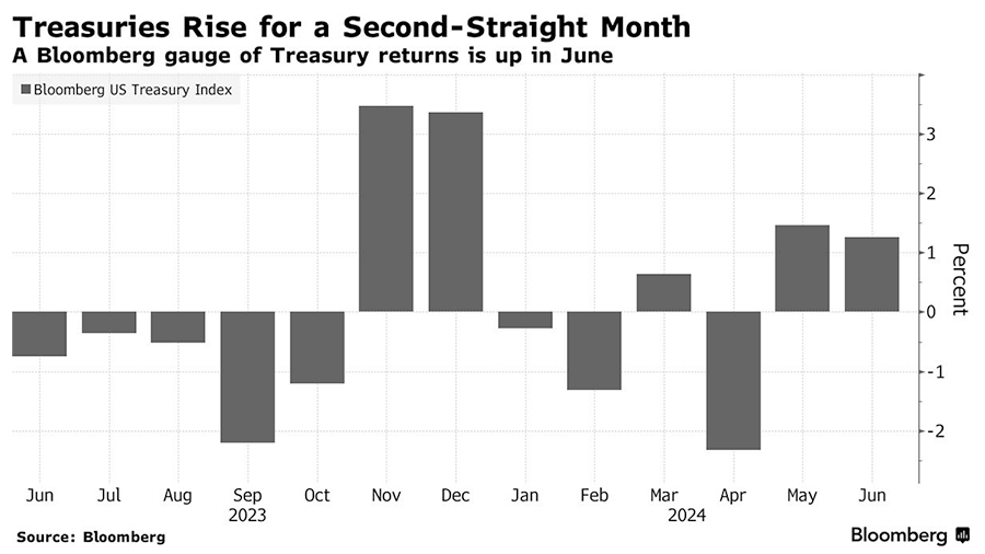 The US Treasury market saw a notable shift on the last trading day of June, with yields climbing as bond indexes rebalanced. Longer-maturity yields rose over 10 basis points, influenced by international inflation pressures and currency volatility. Gregory Faranello of AmeriVet Securities noted the volatility but indicated that yields aren’t being driven significantly lower despite weaker data. Ten-year yields, which initially dropped earlier in the day, surged by up to 12 basis points late in the session, fueled by high trading volumes during Bloomberg Indices' rebalancing. This process, impacting bond trading, involves adding and removing bonds, creating unpredictable market movements. Despite the day's selloff cutting short a major monthly bond rally, ten-year yields were down 12 basis points in June after a larger drop in May. This week’s developments paused a two-month Treasury rally supported by indications of easing inflation and labor market conditions. The PCE price index showed no change in May, suggesting inflation might be stabilizing. However, the 10-year yield remained above 4.2%, with Federal Reserve officials signaling caution before reducing interest rates. Richmond Fed President Thomas Barkin emphasized ongoing inflation concerns, and San Francisco Fed President Mary Daly pointed to effective monetary policy but cautioned against premature rate cuts. While bond investors initially anticipated six rate cuts for 2024, expectations have moderated to about 45 basis points, with a quarter-point cut likely by November. Looking ahead, traders will focus on June employment data and ongoing economic indicators to assess the Fed's policy trajectory, amidst uncertainty surrounding the US presidential election. Jason Williams from Citigroup remains neutral, awaiting further labor market data to justify yields below 4%.