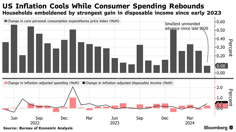 In May, the Federal Reserve's preferred measure of underlying US inflation, the core personal consumption expenditures (PCE) price index, rose by only 0.1% from the previous month, marking the smallest increase in six months and indicating the potential for lower interest rates later in the year. This measure, which excludes volatile food and energy prices, showed a mere 0.08% increase on a two-decimal basis, the smallest since late 2020. On an annual basis, core PCE rose 2.6%, in line with forecasts and lower than the prior month’s 2.8% increase. Simultaneously, household spending rebounded from a decline in April, supported by solid income growth. Inflation-adjusted consumer spending growth was particularly strong in goods, driven by increased incomes. This combination of slower price increases and robust spending provides some optimism for Fed officials, who had seen signs of economic slowdown earlier in the week. Bill Adams, chief economist at Comerica Bank, noted that the economy is showing positive signs with persistent growth, moderating inflation, and a more balanced job market. This kind of data supports the Fed's view that inflation may be returning to normal levels. Central bankers are closely monitoring services inflation excluding housing and energy, which tends to be more persistent. This metric rose by 0.1% in May, the smallest increase since October. Household demand has remained strong despite higher borrowing costs affecting some economic sectors. Inflation-adjusted outlays for services increased by 0.1%, driven by airfares and healthcare, while spending on goods rose by 0.6%, led by purchases of computer software and vehicles. Despite some labor market cooling, strong wage growth continues to fuel consumer spending, with wages and salaries rising by 0.7%. Real disposable income, adjusted for inflation, increased by 0.5%, the most significant rise since January 2023. However, Bloomberg economists expressed skepticism about the persistence of the disinflation process, citing the likelihood of core services categories maintaining inflation levels in the latter half of the year. The saving rate also rose to 3.9%, the highest since the beginning of the year, while separate data indicated a slight decline in consumer sentiment and moderated inflation expectations in June.