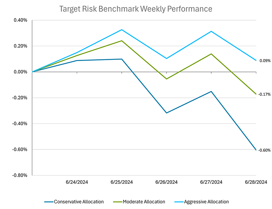 Investors in balanced multi-asset class portfolios experienced a week of choppy trading to close out what had otherwise been a strong month overall. The aggressive risk benchmark below has a roughly 90% allocation to global equities, with a small allocation to bonds. Meanwhile, the moderate risk benchmark is a 60/40 split of global equities and bonds, while the conservative risk benchmark has a roughly 90% allocation to US bonds. Bonds started the week with small gains but declined on Wednesday, followed by a small rally Thursday through Friday midday, before ultimately finishing the week down -0.71%, as measured by the Bloomberg US Aggregate Bond Index. US equities were choppy throughout the week, bouncing between gains and losses, before finishing essentially flat. International equities fared better with strong gains to start the week before giving some back, with the MSCI ACWI ex USA IMI Index finishing with a gain of 0.45%. Ultimately the tough stretch for bonds for the week weighed on the conservative target risk benchmark more heavily, which ended with a loss of -0.6% for the period. The moderate target risk benchmark held up better with a small loss of -0.17%, while the aggressive target risk benchmark benefitted most from the positive stretch for international equities, finishing with a gain for the week of 0.09%.