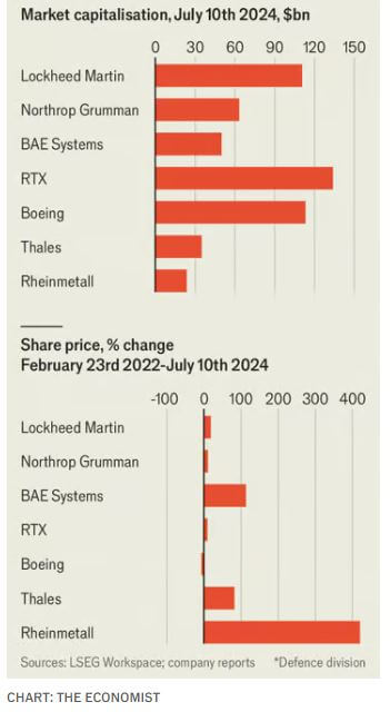 The arms industry operates uniquely, insulated from macroeconomic trends and consumer preferences, driven primarily by the perceived military threats faced by its government customers. Recent conflicts in Ukraine, Gaza, potential tensions between Israel and Lebanon, and China's interest in Taiwan have heightened threat perceptions, influencing NATO's defense spending. In 2023, NATO's 32 members spent $1.3 trillion on defense, a record high since the Soviet Union's fall, with the U.S. alone budgeting $842 billion. NATO's traditionally frugal European members are reversing decades of underinvestment in military equipment, with 18 members expected to meet the 2% of GDP defense spending target this year, up from just three in 2014. Of NATO's total defense budget, $360 billion was allocated to weapons systems and major equipment, double the share from ten years ago, and this trend is expected to continue. This surge in defense spending benefits American prime defense contractors like Lockheed Martin, RTX, and Northrop Grumman. However, despite a substantial budget for procurement and R&D, their market values have stagnated since Russia's invasion of Ukraine. In contrast, European firms like Thales, BAE Systems, and Rheinmetall have seen significant share price increases. American defense contractors face capacity constraints due to years of reduced production post-Cold War and a shift in priorities post-9/11 towards counterterrorism and maritime defense against China. Restoring this capacity will take years and depends on sustained demand. Meanwhile, European defense spending is increasing more predictably. Additionally, the U.S. Department of Defense (DoD) is shifting procurement strategies, moving from cost-plus to fixed-price contracts, which place more financial risk on contractors. This change has led to losses for firms like Northrop Grumman and Boeing. The DoD is also emphasizing agile, smart systems over traditional large-scale platforms, attracting competition from newer, non-traditional defense firms like Anduril and Palantir, which are winning significant contracts. Despite challenges, legacy programs and rising foreign military sales continue to support American prime contractors. Future increases in U.S. defense spending remain possible, especially with political changes or supplementary appropriations. Although the prime contractors must adapt to new procurement dynamics and competition, they remain influential players in the defense sector.