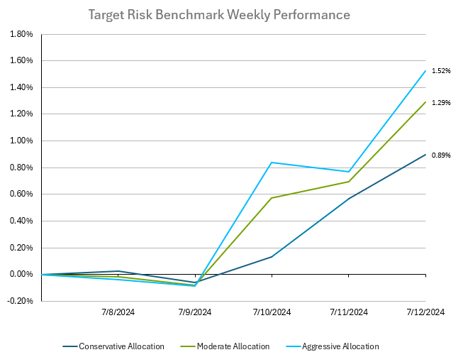 Investors in balanced multi-asset class portfolios enjoyed healthy gains across all risk tolerances last week. The aggressive risk benchmark below has a roughly 90% allocation to global equities, with a small allocation to bonds. Meanwhile, the moderate risk benchmark is a 60/40 split of global equities and bonds, while the conservative risk benchmark has a roughly 90% allocation to US bonds. The major catalyst for markets this week was the June consumer price index (CPI) data, which came in below expectations. Markets shrugged off weak consumer sentiment data and producer price index (PPI) data that came in above estimates, as another month of soft inflation data has led many analysts to believe that the Fed in on track to cuts rates, possibly as soon as September. Treasuries rallied, with US 10-year yields declining to 4.18% to end the week. The Bloomberg US Aggregate Bond Index ended the week with a strong gain of 0.83%. Smaller firms' rebound was significant, with the Russell 2000 viewed as an indicator of interest-rate easing and economic conditions. The Russell 2000 index had its best week since November. Market analysts are debating whether the recent market rotation indicates a trend reversal or a temporary shift. While US markets as measured by the Russell 3000 Index had a substantial gain of 1.38% for the week, international equities had an even stronger period, with the MSCI ACWI ex USA IMI Index gaining a full 2.01%. Future economic data and earnings reports are expected to provide further clarity on market direction.