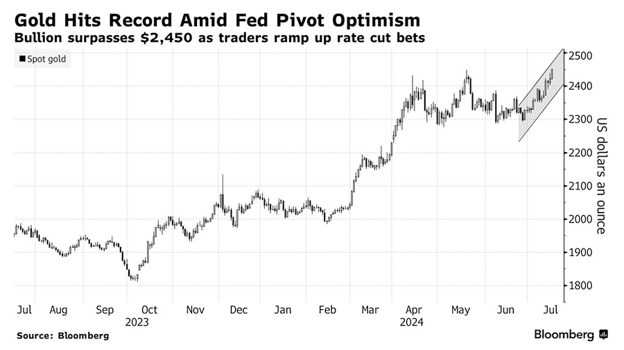 Gold prices surged to an all-time high of $2,469.66 an ounce, surpassing the previous peak set in May, driven by growing expectations of Federal Reserve rate cuts and increased speculation of a second Donald Trump presidency. This rally is attributed to signals of slowing inflation in the US, prompting speculation that the central bank may soon lower interest rates. Typically, high interest rates negatively impact gold, which does not yield interest. However, gold has risen nearly 20% this year, buoyed by significant central bank purchases, strong consumer demand in China, and heightened interest in haven assets due to geopolitical tensions. The recent increase in exchange traded fund holdings has also contributed to the upward momentum. Ewa Manthey, a commodities strategist at ING Bank NV, noted that optimism about US interest rate cuts, supported by economic data, is bolstering gold. She highlighted that gold is likely to maintain its positive momentum amid the current geopolitical and macroeconomic environment, with central bank demand expected to grow. Fed Chair Jerome Powell indicated that recent data has increased confidence that inflation is moving towards the central bank's 2% target, leading traders to anticipate two quarter-point rate cuts this year. Goldman Sachs has suggested that conditions are favorable for easing, potentially as soon as July. The upward trend in gold was anticipated by some analysts, with consultancy Metals Focus predicting a new record this year and Citigroup forecasting gold prices between $2,700 and $3,000 an ounce by 2025. Additionally, speculation around Trump's potential return to the White House, following a failed assassination attempt and the dismissal of a criminal case against him, is influencing market sentiment. David Higgins of Merrion Gold suggested that a Trump presidency might drive retail customers to buy gold due to perceived instability.