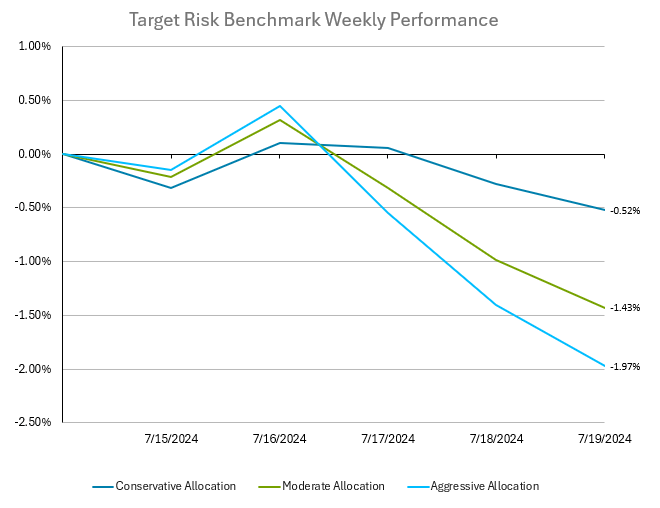 Stocks ended the week on a downtrend as major technology companies prepare to report earnings at a critical juncture for Wall Street. The S&P 500 experienced its worst week since April, driven by a rotation where investors shifted from this year’s high performers to laggards such as value stocks and small caps. This move anticipated a broader market rally with expected Federal Reserve rate cuts in 2024. Tech stocks, particularly the “Magnificent Seven” mega-caps, fell 5% on Friday, with semiconductor stocks like Nvidia and Intel dropping nearly 9%. This coming week will be pivotal, with key earnings reports from tech giants and economic data releases, including the Fed’s preferred price gauge. Analysts suggest strong tech earnings and easing inflation could reverse recent market weaknesses. Treasury yields rose slightly, and economic data supported expectations for easier monetary policy. Lower rates could benefit small caps, though a significant market shift is not yet certain. Tesla and Alphabet will report earnings first, followed by Microsoft, Meta, Amazon, and Apple in the subsequent week. Goldman Sachs strategists anticipate a potential market correction rather than a bear market, influenced by weaker growth data, dovish central bank expectations, and rising policy uncertainty ahead of the US elections. Despite recent market moves, US equity funds saw significant inflows, indicating strong investor confidence in forthcoming Fed rate cuts and election outcomes. International stocks endured a tough week as well, with the MSCI ACWI ex-USA IMI Index finishing the week with a loss of -2.91%. In this environment, multi-asset class balanced portfolios had a week of losses through a choppy week of trading, giving up the gains from the prior week following a benign CPI data release. The aggressive risk benchmark below has a roughly 90% allocation to global equities, with a small allocation to bonds. The moderate risk benchmark is a 60/40 split of global equities and bonds, while the conservative risk benchmark has a roughly 90% allocation to US bonds. The aggressive target risk benchmark finished the week with a loss of nearly 2%, while the moderate target risk benchmark was not far behind with a loss of -1.43%. Bonds held up much better than equities for the week, limiting losses for the conservative target risk benchmark to -0.52%.