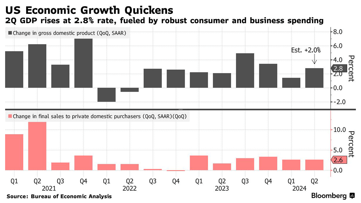 US economic growth rebounded in the second quarter of 2024, with GDP increasing at an annualized rate of 2.8%, surpassing forecasts and the previous quarter’s 1.4% rise. This growth was primarily driven by a 2.3% increase in personal spending, also exceeding projections. However, a key measure of underlying inflation rose 2.9%, slightly above estimates, although it did decelerate from the first quarter. Despite this acceleration, the economy showed signs of moderation from the previous year, as high interest rates curbed some underlying economic activity. Notably, consumer spending on durable goods like cars and furnishings rebounded, and government spending, particularly in defense, contributed more to GDP growth. Conversely, residential investment declined due to high mortgage rates. Business investment saw the fastest growth in almost a year, driven by significant advances in equipment orders. Factory orders for business equipment, excluding aircraft and defense, surged in June, recovering from a previous month’s decline. Additionally, inventories added to GDP for the first time since the third quarter of the previous year, offsetting a near-record trade deficit. Inflation-adjusted final sales to private domestic purchasers, which strips out government spending, trade, and inventories to provide a gauge of underlying demand, rose 2.6% for the second straight quarter. Looking ahead, economists predict a more pronounced economic slowdown in the latter half of the year as the labor market weakens and income growth decelerates, further impacting consumer spending. Recent corporate earnings reports suggest Americans are beginning to pull back on spending and facing increasing financial strain.