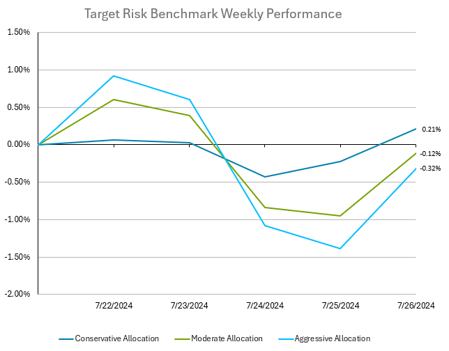 The stock market experienced a notable rise on Friday at the end of a tumultuous week, driven by economic data suggesting the Federal Reserve might initiate an interest-rate cut in September. This speculation fueled optimism across the S&P 500, which saw gains across all sectors, moving beyond its reliance on a few tech giants. Despite strong performances from big tech earlier in the year, concerns about concentration risk increased following a lackluster start to the earnings season for the mega-cap companies. This shift led investors to diversify into economically sensitive shares. Financials, industrials, and staples have outperformed tech in July, while small caps surged by 10%, benefiting from expectations of lower rates for their higher debt burdens. George Maris of Principal Asset Management noted this rotation’s potential lasting power, driven by forecasts for a broader earnings recovery in smaller companies. Quincy Krosby at LPL Financial highlighted the interest-rate sensitivity of small caps, but also the risks that an economic slowdown would pose for them. The upcoming earnings reports from major tech firms will be crucial in determining the market's direction amid mixed economic signals and a typically negative seasonal pattern. The recovery in markets on Friday benefited balanced multi-asset class investors, regardless of their risk tolerance. This can be seen in the target risk benchmarks below. The aggressive risk benchmark has a roughly 90% allocation to global equities, with a small allocation to bonds. The moderate risk benchmark is a 60/40 split of global equities and bonds, while the conservative risk benchmark has a roughly 90% allocation to US bonds. Both cash equivalents and domestic bonds had positive returns for the week, which resulted in the conservative target risk benchmark having the best return for the week at 0.21%. The moderate and aggressive target risk benchmarks had significant losses through the middle of the week but recovered as equities bounced back. The moderate target risk benchmark finished with a loss of -0.12%, while the aggressive target risk benchmark cut its weekly loss to -0.32%.