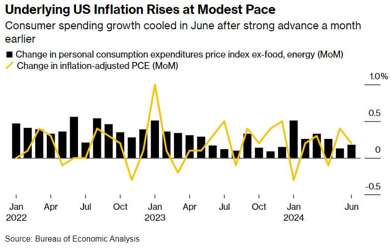 In June, the Fed's preferred inflation measure, the core Personal Consumption Expenditures (PCE) price index, increased by a modest 0.2% from May and 2.6% year-over-year, indicating underlying inflation rose at a manageable rate, and in line with forecasts. This measure excludes volatile food and energy prices, providing a clearer view of sustained inflation trends. Inflation-adjusted consumer spending also grew by 0.2%, while May's spending increase was revised higher, signaling robust consumer activity. Despite these positive signals, consumer sentiment, as measured by the University of Michigan, fell to an eight-month low in July, reflecting persistent concerns over high prices. Core inflation, on a three-month annualized basis, decelerated to 2.3%, suggesting the Fed's tightening measures are gradually influencing the economy without severe repercussions. Key factors included a 0.2% rise in services inflation, excluding housing and energy, and steady increases in inflation-adjusted outlays for services and goods, driven by housing, utilities, vehicles, and recreational items. However, wage growth slowed to 0.3% in June, half the previous month's rate, leading to a deceleration in disposable income growth to 0.1%. Bloomberg Economics analysts highlighted that consumer spending, though healthy, is slowing amid weaker income growth and a cooling labor market. The saving rate dropped to 3.4%, the lowest since December 2022, indicating diminished consumer capacity for future spending. Rising credit card delinquencies and upcoming employment data will further illuminate the economic outlook, particularly regarding income growth and consumer resilience. This data suggests that inflation and economic activity are cooling sufficiently to open the door for future interest rate cuts. The consensus among analysts is that the Fed will maintain its current interest rate at its upcoming meeting while setting the stage for potential rate cuts in September.