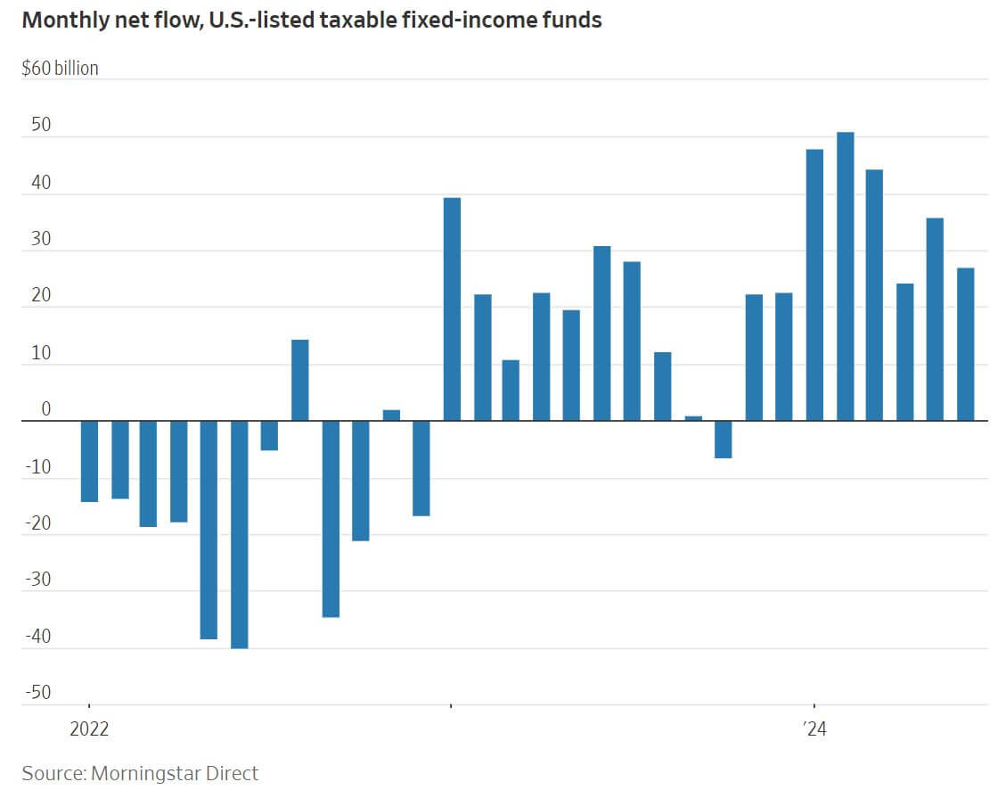 Wall Street has seen an unprecedented surge in bond fund investments this year, driven by the highest bond yields in a generation and an impending drop in interest rates. This has resulted in substantial inflows into both indexed and actively managed bond funds as investors seek to mitigate risk, especially retirees. U.S.-listed fixed-income ETFs alone have garnered nearly $150 billion by late July, marking a record influx. The environment of high rates and falling inflation presents a rare opportunity for substantial investment income, attracting significant interest in bond funds. Expectations of Fed rate cuts have shifted investor focus from cash-like investments to bonds, seizing the moment before yields decline further with rising bond prices. This trend is particularly benefiting actively managed bond funds. According to Morningstar, 74% of such funds have outperformed their benchmarks over the past year. Investors are diversifying their bond fund choices, ranging from Treasury ETFs for interest-rate bets to actively managed funds in high-yield corporate debt and collateralized loan obligations. The renewed interest in bonds marks a stark contrast to 2022, when rising rates caused significant losses in bond funds and the classic 60/40 stock-bond portfolio suffered its worst performance since the Great Depression. However, with anticipated rate cuts and the bond market’s resurgence, Wall Street analysts advocate for renewed bond investments to capitalize on current yields before they potentially decline. This broad-based enthusiasm for bond funds is attributed to a combination of stock market gains prompting risk balancing and the strategic anticipation of rate cuts enhancing bond valuations.