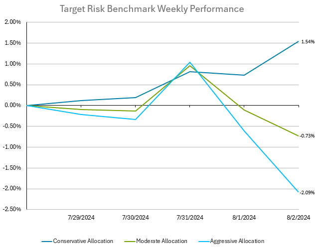 The sudden flight to safety led to a sharp divergence in returns for aggressive and conservative investors, as shown by the target risk benchmarks below. The aggressive risk benchmark has a roughly 90% allocation to global equities, with a small allocation to bonds. The moderate risk benchmark is a 60/40 split of global equities and bonds, while the conservative risk benchmark has a roughly 90% allocation to US bonds. The equity selloff resulted in a -2.09% loss for the aggressive target risk benchmark, while the fixed income rally limited losses in the moderate target risk benchmark to -0.73% for the week. The conservative target risk benchmark benefited from the large drop in bond yields, leading to a weekly gain of 1.54%.