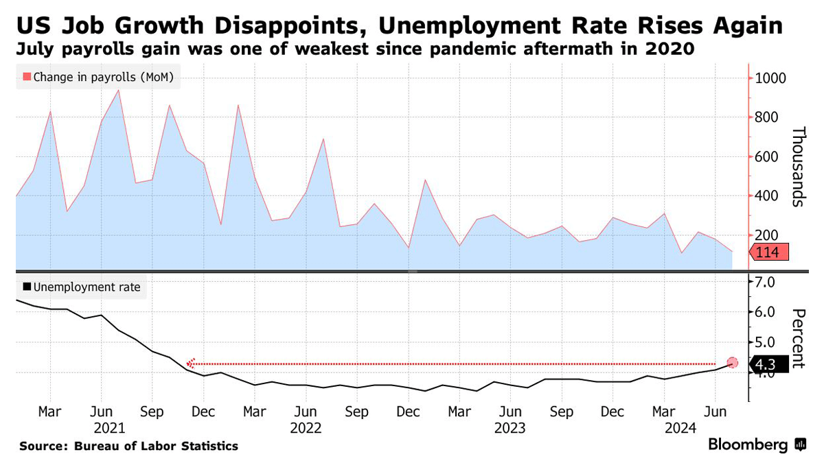 The Federal Open Market Committee (“FOMC”) unanimously decided to maintain rates in the 5.25% to 5.5% range last week, although Federal Reserve Chair Jerome Powell noted that some officials favored a rate cut during the two-day meeting. During the press conference following the FOMC meeting, Powell highlighted improved inflation data, a desire to prevent rising unemployment, and the belief that Fed policy is increasingly slowing economic activity. Powell stated that “the broad sense of the committee is that the economy is moving closer to the point at which it will be appropriate to reduce our policy rate.” The Fed’s policy statement reflected progress in combating inflation, describing it as “somewhat elevated,” a downgrade from previous descriptions. This change signals a shift toward balancing the Fed’s dual mandate of controlling inflation and maintaining a strong labor market. The Fed faces two risks: easing too soon, allowing inflation to remain above the 2% target, or delaying too long, causing economic strain from high rates. The economy has shown resilience, with GDP growth at 2.1% in the first half of the year and recent inflation data indicating a slowdown in price growth. However, new data released after the FOMC meeting showed that the US labor market exhibited significant weakening in July, with nonfarm payrolls increasing by just 114,000, a figure lower than nearly all predictions and one of the weakest since the pandemic's onset. The unemployment rate rose to 4.3%, the highest in almost three years. This unexpected uptick in unemployment, alongside lower-than-forecast average hourly earnings, suggests a faster-than-anticipated labor market deterioration. The disappointing jobs report contributed to a broader week of underwhelming economic data, spurring a stock market sell-off and reducing Treasury yields. Economists, including those from Bloomberg and LH Meyer/Monetary Policy Analytics, highlight that the labor market is cooling more rapidly than desired, potentially necessitating more aggressive rate cuts.