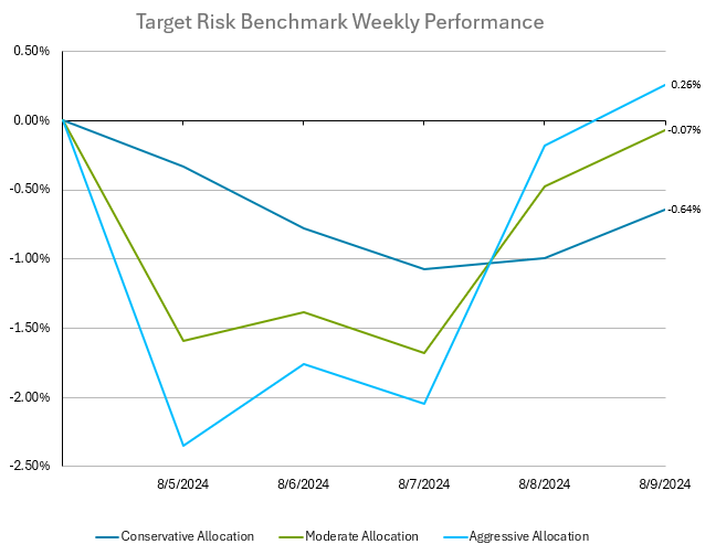 Investors in multi-asset portfolios trimmed losses by a significant margin to end the week, as seen in the target risk benchmarks below. The aggressive risk benchmark has a roughly 90% allocation to global equities, with a small allocation to bonds. The moderate risk benchmark is a 60/40 split of global equities and bonds, while the conservative risk benchmark has a roughly 90% allocation to US bonds. Counterintuitively, the aggressive target risk benchmark fared better for the week than the conservative risk benchmark as equities recovered while bonds gave back much of the aggressive rally seen earlier. The aggressive target risk benchmark finished the week with a gain of 0.26%, while the moderate benchmark lost -0.07%. The conservative target risk benchmark in contrast ended the week with a loss of -0.64%.