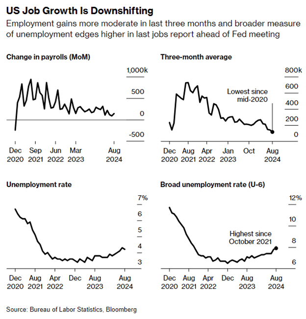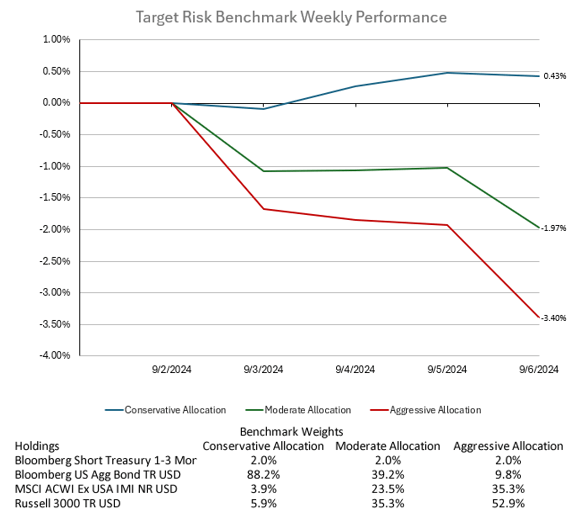 Stocks pulled back but bonds rallied following downbeat U.S. economic releases and a continuing slump in Chinese domestic demand. Friday’s non-farm payrolls indicating a slowing hiring climate may not point towards a recession, but it presents the Federal Reserve with a dilemma in having to balance the risks of slowing labor market conditions while trying to achieve price stability. U.S. Treasuries rallied with yields on two-year notes falling by up to 26 basis points to 3.66%. The 10-year yield settled at 3.72%, down from 3.90% the prior week. This sharp movement in rates continues to support market expectations of a significant easing cycle, with traders now pricing in 1.50% rate cuts by the end of January 2025, possibly including a 50-basis-point reduction at the September FOMC. U.S. stocks were weighed down by a more somber outlook for artificial intelligence-driven spending and news reports of antitrust probes targeting large semiconductors as well as downbeat earnings releases from retailers focused on lower income segments. For the week ending 9/6/2024, the S&P 500 returned -4.14%, underperforming the international markets with MSCI ACWI ex USA returning -3.64%. The Bloomberg U.S. Aggregate Bond Index returned 0.94%, benefiting from this week’s sharp drop in interest rates. The aggressive target risk benchmark returned -3.40%, while the moderate target risk benchmark returned -1.97%. The conservative benchmark benefited from its higher allocation to bond, returning 0.43% for the week.