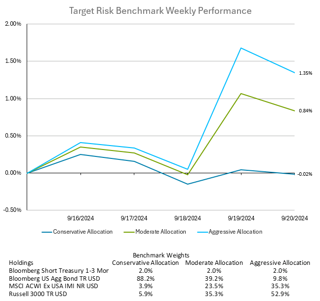 US stocks fluctuated on Friday due to the expiration of derivatives contracts and a significant rebalancing. The quarterly “triple witching” event involved the expiration of $5.1 trillion in derivatives and $250 billion in index trades, leading to volatility. Traders weighed differing views from Federal Reserve Governors: Christopher Waller supported a recent half-point interest-rate cut based on favorable inflation data, while Michelle Bowman warned that the move might be premature. Fed policymakers anticipate further rate cuts, but some, like JPMorgan CEO Jamie Dimon, are skeptical about the possibility of a smooth economic landing without a recession. Gold hit a record high above $2,600 per ounce amid geopolitical tensions, while the dollar strengthened and Treasuries were mixed. Amid optimism over Fed easing, Bank of America’s Michael Hartnett warned that the rally could lead to a bubble, making bonds and gold appealing hedges against inflation or recession. Meanwhile, the yen weakened after the Bank of Japan’s Governor Kazuo Ueda downplayed inflation risks and indicated no immediate rate hikes. This week, investors will focus on upcoming data releases, including PMI, GDP, and the Fed’s preferred inflation gauge, PCE, which could shape future market moves. Despite equities giving back some of Thursday’s gain to end the week, aggressive investors benefitted the most last week, as shown by the target risk benchmarks below. The aggressive target risk benchmark ended the week with a gain of 1.35%, while the moderate target risk benchmark recorded a healthy gain of 0.84%. The mixed performance of bonds for the week left the conservative target risk benchmark essentially unchanged for the week.