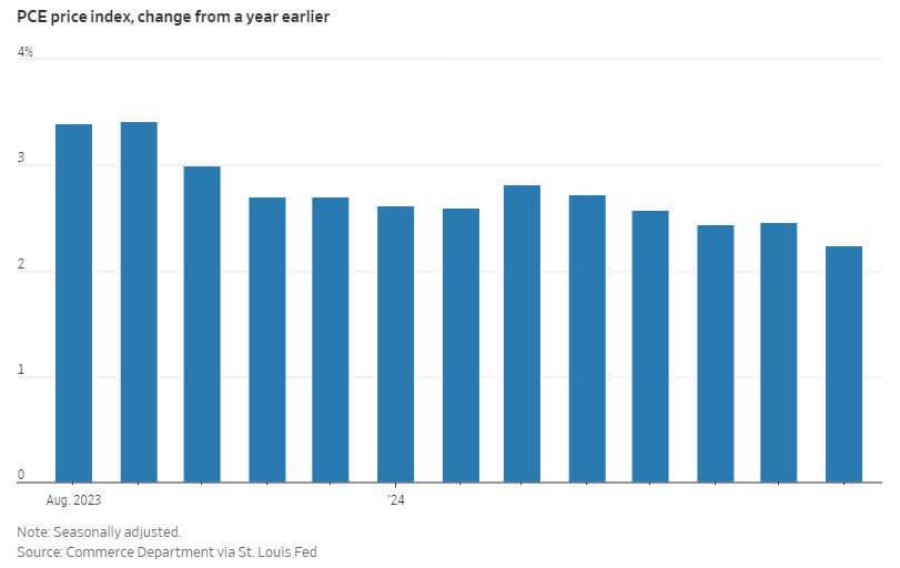 In August, the core personal consumption expenditures (PCE) price index, the Fed's preferred measure of underlying US inflation, rose modestly by 0.1% from July, indicating a cooling economy. On a three-month annualized basis, core inflation increased by 2.1%, aligning with the Fed's 2% target. Consumer spending, adjusted for inflation, also increased by 0.1%, while nominal personal income rose 0.2%. The personal saving rate declined slightly to 4.8%. The data suggests the Fed may continue its recent easing of monetary policy, as Treasury yields and the dollar fell in response. The Fed recently initiated a half-point rate cut, and market participants are divided on whether another significant cut will occur in November. The August data revealed broad cooling, with services prices excluding housing and energy rising 0.2% for the second consecutive month, and goods prices excluding food and energy dropping 0.2%, the most in three months. Bloomberg economists suggest that the cooling in income and inflation supports the Fed's recent decision to cut rates and predict a continued focus on employment to balance its dual mandate. Economists predict that U.S. inflation will reach the Federal Reserve's 2% target by early next year, closely aligning with the Fed's latest projections. The Fed's recent economic forecasts project the PCE index to average 2.1% in 2025 and 2% in 2026. Both the Fed and surveyed economists anticipate further rate cuts, totaling another half-point reduction by year-end. Regarding the labor market, both economists and Fed officials foresee the unemployment rate averaging 4.4% in 2025, slightly higher than the current 4.2%. While recession odds for the next year have decreased to 30%, the US economy is expected to slow, with GDP growth forecasted to decline from 2.6% this year to 1.8% in 2025, compared to the Fed's 2% estimate for 2024-2026.