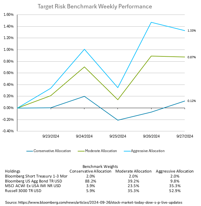 US stocks had their third straight week of gains last week, despite Friday's mixed performance, as investors gain confidence that the economy is cooling without a sharp downturn. Treasury yields fell as data reinforced expectations of further interest rate cuts by the Federal Reserve. The dollar had a fourth consecutive weekly loss, and the 10-year Treasury yield ended the week around 3.75%. Global central banks in Switzerland, Mexico, Hungary, and the Czech Republic cut interest rates, bolstering market sentiment. This week, US jobs data will be crucial in gauging the labor market's health. Chris Larkin of E*Trade noted that recent data supports a balanced economic environment, with inflation subdued and no signs of a sharp slowdown. Damian McIntyre of Federated Hermes emphasized the strength of recent economic indicators as a positive sign for investors. Globally, China’s CSI 300 Index saw its best week since 2008, and European stocks reached record highs, closing their best week in over four months. Oil prices rose following increased tensions in the Middle East after Israel struck Hezbollah’s headquarters in southern Beirut. The week was better for aggressive investors than for conservative investors, as seen in the target risk benchmarks below. Much of the improving inflation outlook is already baked into bond yields, meaning that last week’s personal consumption expenditures (PCE) release did not move bond prices much. The conservative target risk portfolio had a small gain of 0.12% as a result. Much of the weekly action was seen in large gains in international equities. This benefitted the moderate and aggressive target risk allocations, which saw gains for the week of 0.87% and 1.33% respectively.