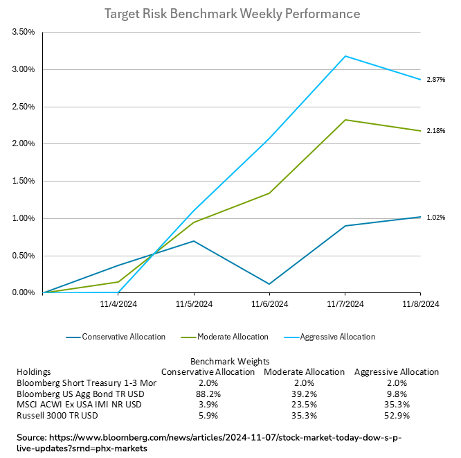 U.S. stocks ended their strongest week of 2024 with gains, buoyed by positive consumer sentiment and optimism over newly elected President Donald Trump’s anticipated policies. The S&P 500 rose for the fourth consecutive session, reaching a 4.7% weekly increase and hitting its 50th record high this year. Tesla’s rapid rise helped it reclaim a trillion-dollar valuation, while defensive stocks took the lead on Friday as some sectors rebounded from oversold conditions. Investor enthusiasm following Trump’s election victory saw $20 billion flow into U.S. equities, the highest inflow in five months, according to Bank of America. Small-cap stocks, seen as potential beneficiaries of Trump’s protectionist policies, experienced their largest inflow since March. The S&P 500 briefly topped the psychologically significant 6,000 level, which analysts say could further attract sidelined investor capital currently held in bonds and money market funds. Despite the strong post-election rally, some experts, like Clark Geranen of CalBay Investments, predict a temporary market pause before further gains toward year-end. Treasury yields on the 10-year note dropped slightly to 4.30%, while the dollar extended its rally for a sixth week, reflecting continued investor confidence in the U.S. economy’s resilience and growth potential under the new administration. The post-election rally benefited investors across all risk tolerances. The aggressive target risk benchmark below benefited the most from the election results with a gain of 2.87% for the week. The moderate target risk benchmark also enjoyed a healthy return of 2.18% for the week. Even the conservative target risk benchmark participated, ending the week up by 1.02%.