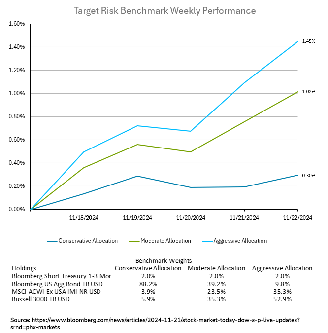 Overseas, Europe’s PMI fell below contraction levels, while sovereign bonds rallied, and the euro hit a two-year low. In Asia, equities are on pace for consecutive monthly losses, weighed down by dollar strength and China’s economic concerns, though attractive valuations spurred recovery in some assets. Equities had stronger gains for the week than fixed income, benefiting more aggressive investors. The aggressive target risk benchmark below saw a healthy return of 1.45% for the week, while the moderate target risk benchmark gained 1.02%. The conservative target risk benchmark had a comparatively quiet week, with a small gain of 0.3%.