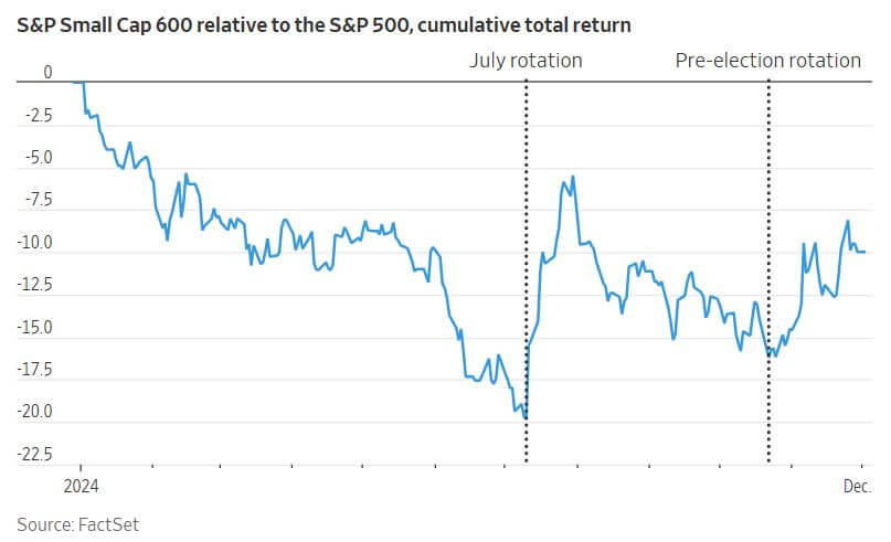 Small-cap stocks have gained prominence as part of the recent “Trump trade,” outperforming the S&P 500 since the November 5 election, with the S&P SmallCap 600 Index rising nearly 8%. This resurgence is fueled by expectations for Republican policies favoring domestic businesses, including lower taxes and lighter regulations. Additionally, the Fed’s interest rate cuts position small-caps favorably in monetary-easing cycles, historically boosting their returns during such periods. Despite their recent performance, small-cap stocks have significantly lagged large-caps over the last several years. Since 2019, they trail the S&P 500 by nearly 40 percentage points. However, valuation gaps present a compelling case for investment. Small-caps trade at 18 times trailing earnings compared to the S&P 500’s 28 times, with historical data indicating that such gaps have led to outperformance in 96% of similar scenarios over five-year periods. Over rolling 10-year periods, high-profitability small-caps have delivered average annualized returns of 14%, outperforming similarly profitable large-caps, which had a return of 12%. This advantage is attributed to the “size effect,” a phenomenon where smaller companies generally deliver better risk-adjusted returns, identified in academic research since 1981. Active fund managers also find opportunities in this space, as avoiding unprofitable small-caps—common in indexes like the Russell 2000—enhances returns. Profitability-focused indexes, such as the S&P 600, further strengthen small-caps’ appeal. While concerns about declining high-quality small-cap companies persist, the long-term data underscores their viability as a core portfolio component. Historically, small-caps have excelled regardless of timing, offering investors both diversification and the potential for appreciation.