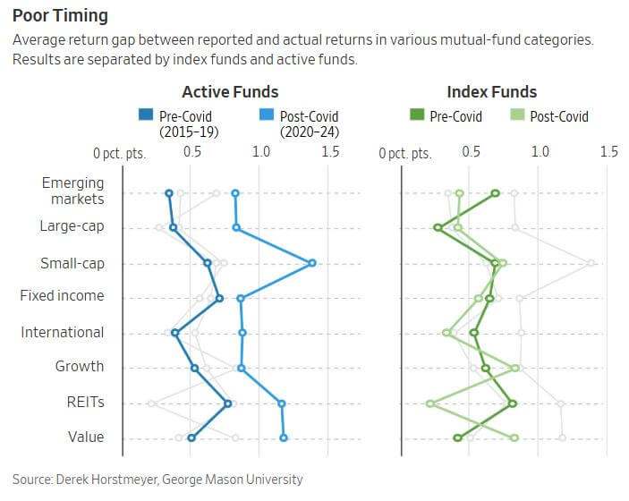The Covid-19 pandemic disrupted individual investor behavior, leading to a significant increase in detrimental trading practices. From 2020 to 2024, investors exhibited heightened tendencies to attempt to time market tops and bottoms, resulting in nearly double the average annual portfolio losses compared to the pre-Covid period. Research by the Wall Street Journal analyzing U.S. mutual fund returns reveals that poor market timing cost investors in actively managed funds an average of 1.01 percentage points annually post-Covid, up from 0.53 points pre-Covid (2015–2019). This effect was most pronounced in U.S. small-cap funds, where the average annual return gap—representing the difference between stated fund returns and actual investor returns—jumped from 0.62 to 1.38 percentage points post-Covid. Similar inefficiencies were observed in other actively traded categories, such as large-cap funds, though the impact was slightly less severe. The trend was less pronounced in index funds, where only four out of eight categories (large-cap, small-cap, value, and growth) showed marginally higher return gaps. These findings underscore the unique risks associated with active fund trading during volatile periods. The study attributes these inefficiencies partly to investor behavior during the pandemic. Homebound individuals, influenced by resources promoting active trading and internet forums like Reddit’s WallStreetBets, engaged in frequent, poorly timed trades during volatile market conditions. This "trigger-happy" approach persisted even as the pandemic's public health threat diminished. The findings reaffirm a long-held investment principle: most investors benefit more from staying invested rather than attempting to time the market. By pulling funds during market lows and investing during highs, many missed out on returns that could have offset fund fees or enhanced portfolio performance. The pandemic-era trading frenzy serves as a cautionary tale for the perils of reactive, short-term investment strategies.